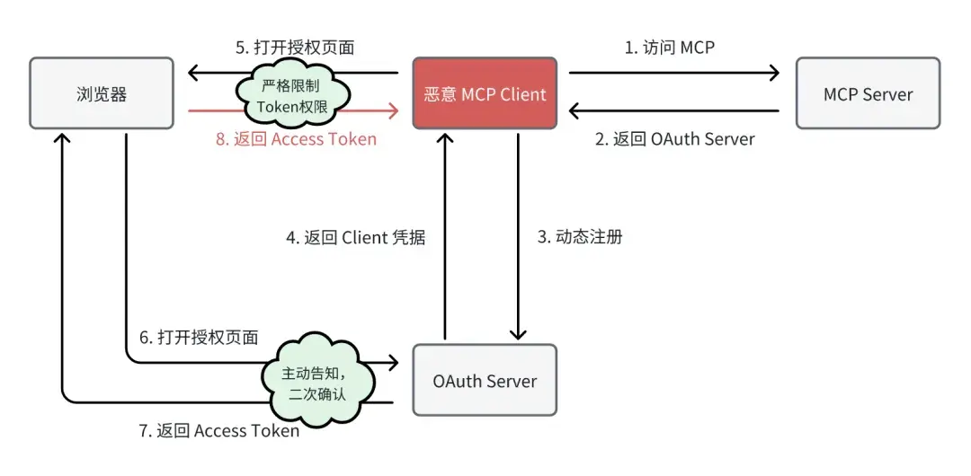 - 权限范围过大:客户端申请了远超其业务所需的权限(scope),一旦令牌泄露,其造成的危害会被不成比例地放大。例如,一个只需要读取 ECS 列表的 MCP Server,却申请了读写用户 IAM 的权限。