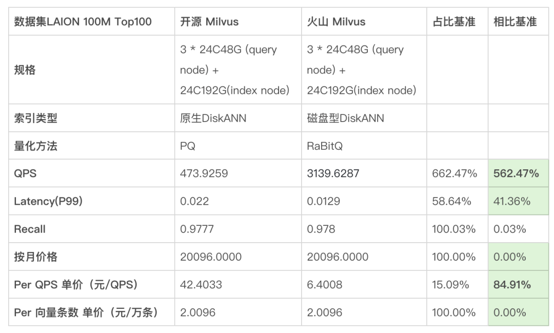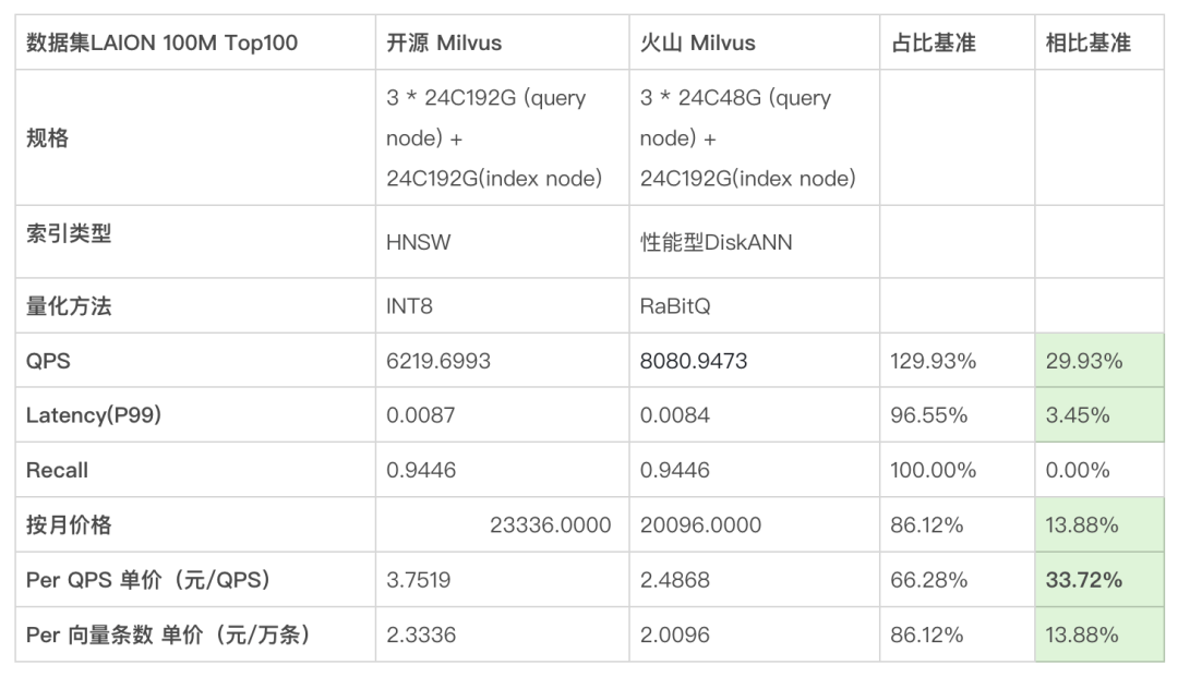 先上结论,在火山 Milvus 无论是容量型向量索引还是性能版向量索引,其性能、成本均全面优于开源 Milvus。