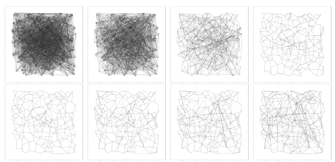 二维平面下的 Vamana 构图过程。首行是第一轮剪枝过程,次行是第二轮剪枝过程。可以观察到第二轮剪枝给 Vamana 构图带来了更多的长边,从而搜索收敛所需“跳数”更少。[3]