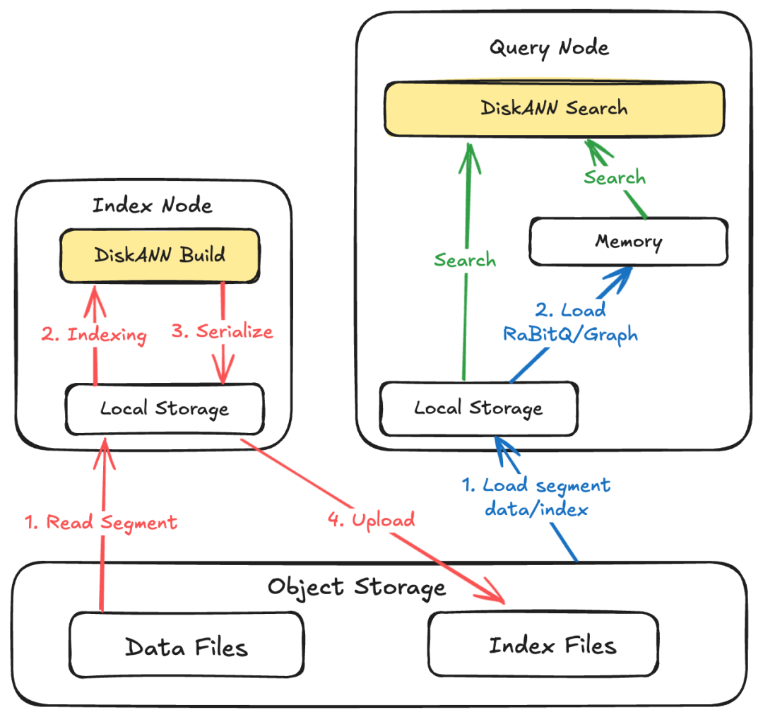 1.构建:Index Node 从对象存储中加载原始数据到本地存储中,DiskANN 通过读取本地存储中的数据集,构建向量索引并生成索引文件落盘。最终,Index Node 将落盘后的索引文件上传至对象存储。