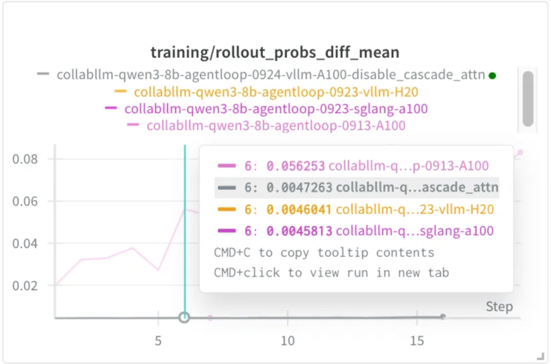 这个问题在切换 GPU 后消失。借助 veRL 的 calculate_log_probs 功能,定位到是推理和训练的精度不一致导致的,默认的推理引擎配置在 A100 上有显著的精度问题。