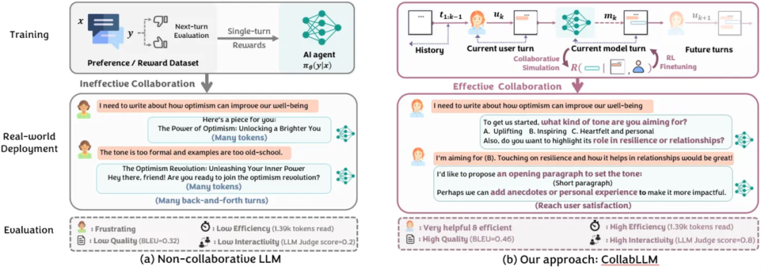 (b) 相比之下,CollabLLM 在训练过程中模拟多轮用户-Agent 交互,使其能够学习有效的协作策略并产生更高效的对话。