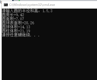 printf("圆周长=%4.2f\n圆面积=%4.2f\n圆球表面积=%4.2f\n圆球体积=%4.2f\n圆柱体积=%4.2f\n",c,s,S,v,V);