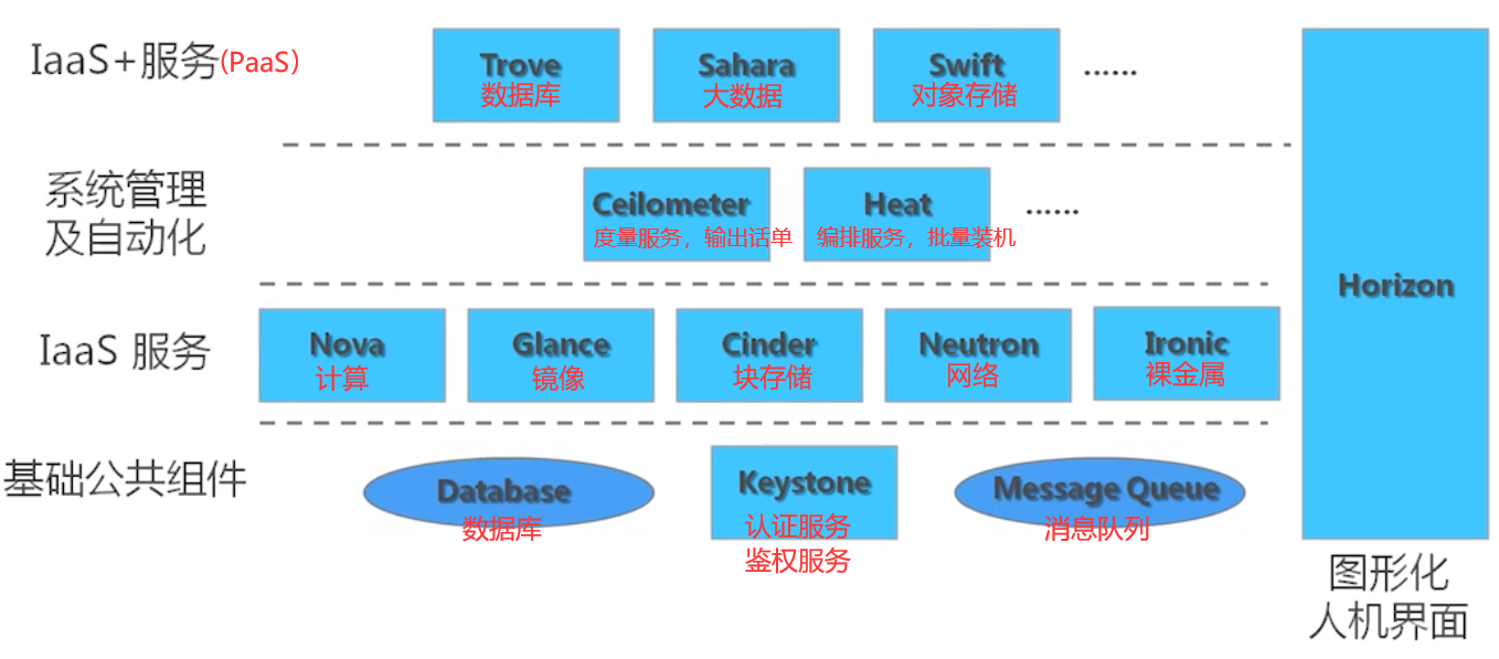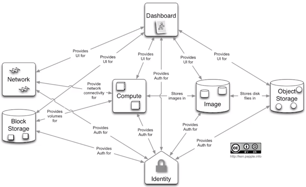 在Dashboard[Horizon]上申请一台云虚拟机流程:Network[Neutron]提供网络,Block Storage[Cinder]提供卷,image[Glance]提供操作系统镜像(image不存储镜像,只存镜像目录,镜像实际存储在Object Storage[Swift]),然后交由Compute[Nova]创建虚拟机。在这个过程中Identity[Keystone]为各个独立的服务提供认证、鉴权服务。