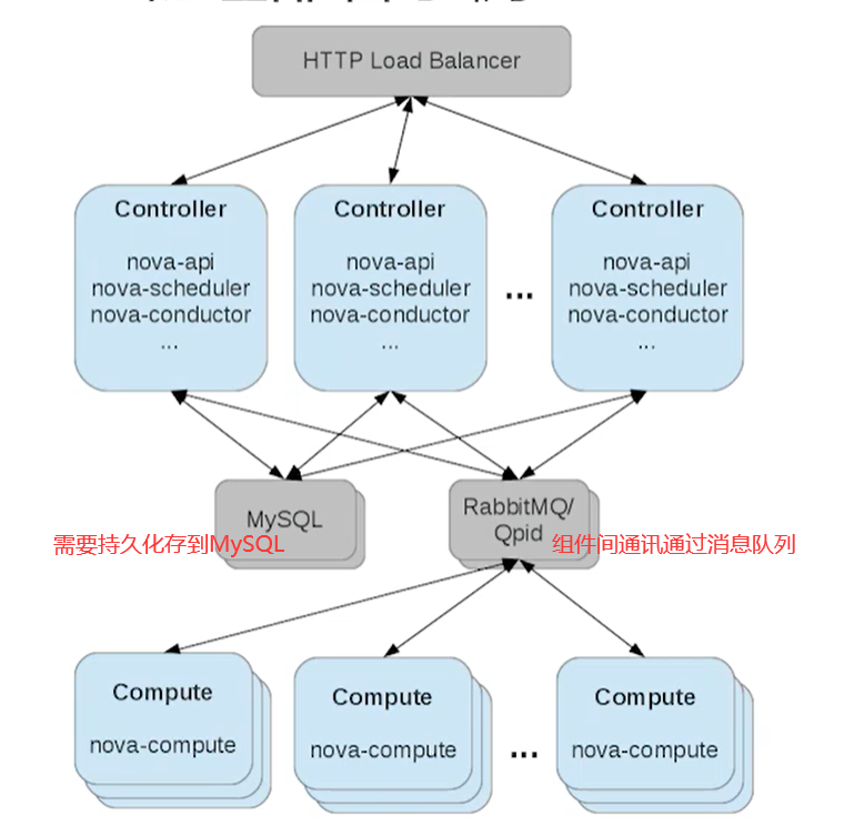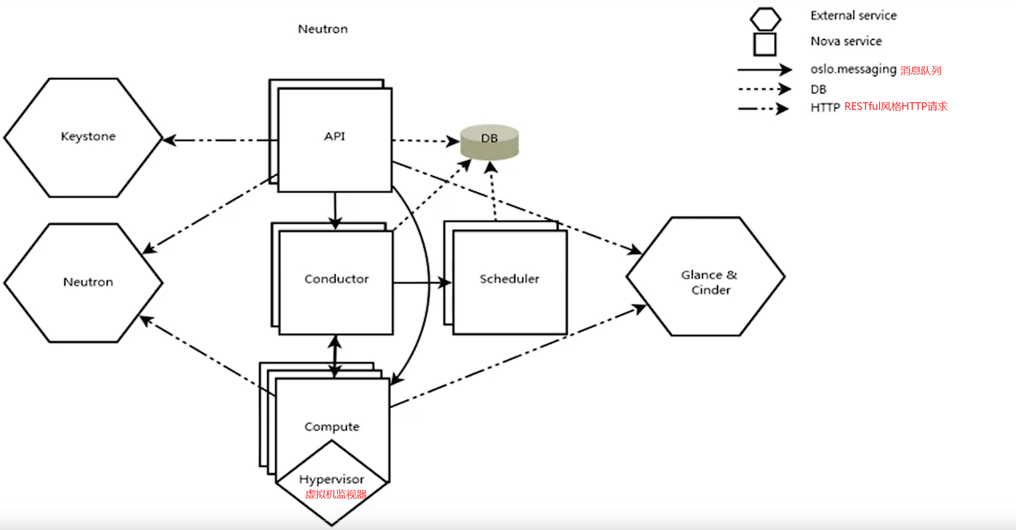 API接收复杂用户请求(创建虚拟机)->Conductor(指令器)->Scheduler(调度器)选择空闲的Compute->Conductor发送指令给Compute