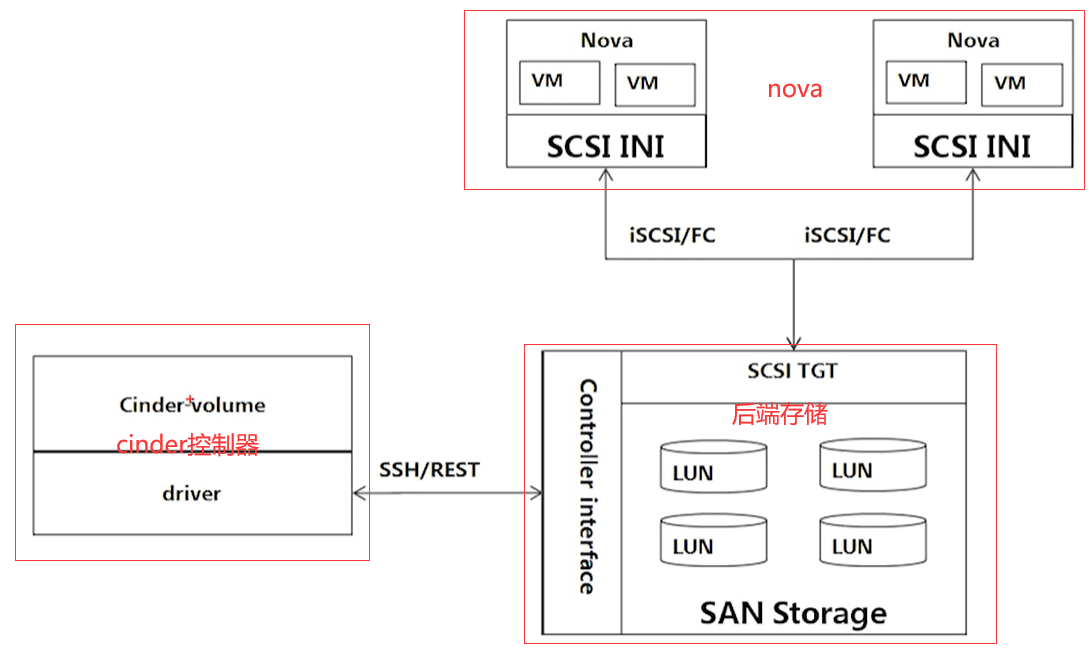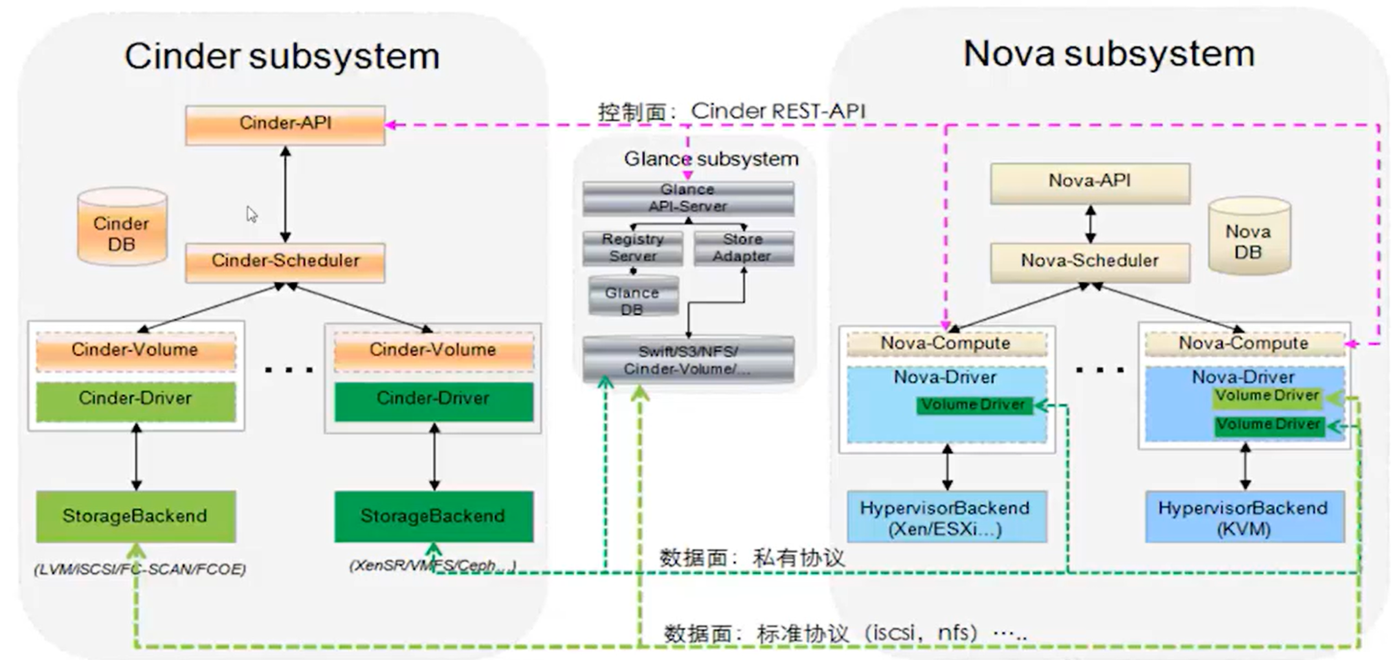 Nova在创建虚拟机到Nova-Compute这一步的时候Nova-Compute向Cinder-API发出创建卷请求,StorageBackend(后端存储)最终创建出这个卷,然后由Nova中的Volume Driver访问这个卷,访问过程中使用的是数据面的协议,不需要经过管理面(openstack)