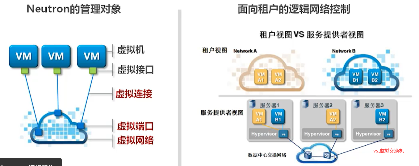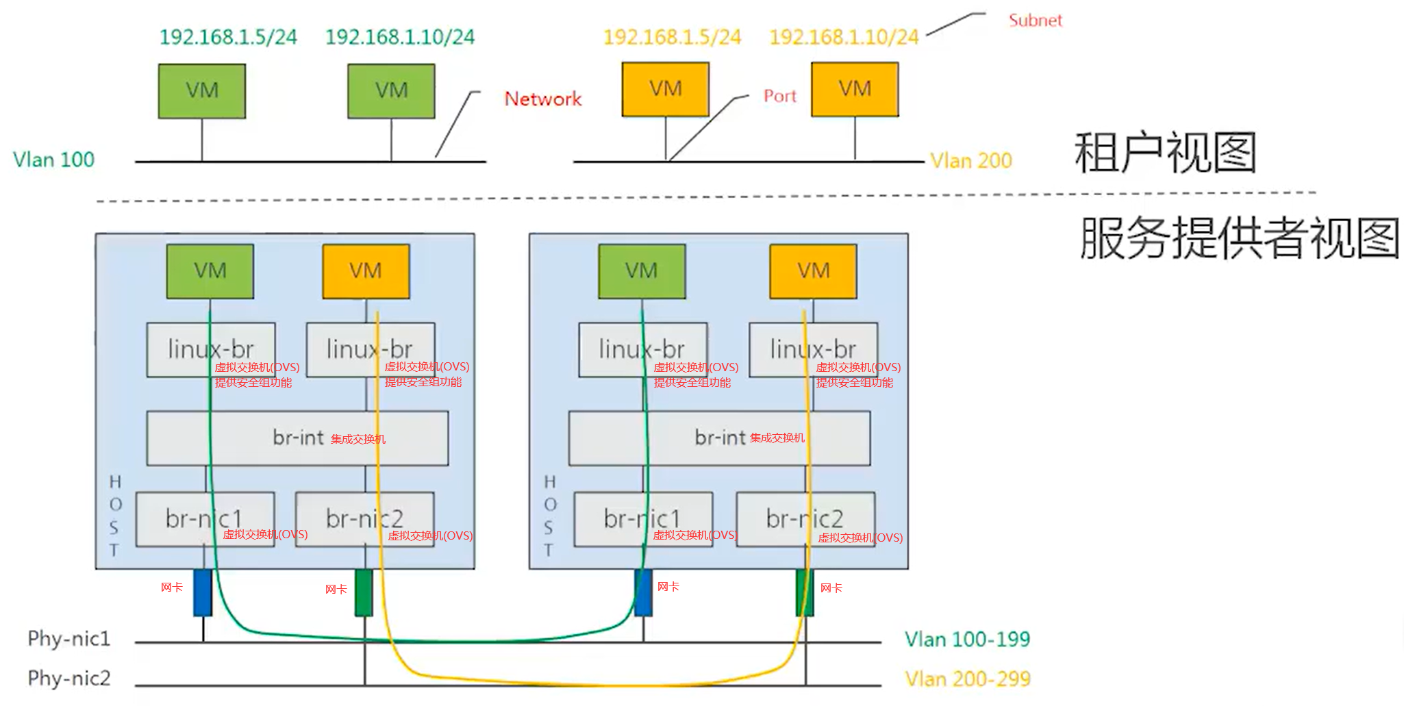 #在服务提供者视图中,neutron可以用vs使处于不同物理机的VM虚拟机属于同一网络