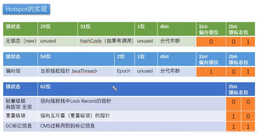 锁的状态总共有四种,级别由低到高依次为:无锁、偏向锁、轻量级锁、重量级锁,这四种锁状态分别代表什么,为什么会有锁升级?其实在 JDK 1.6之前,synchronized 还是一个重量级锁,是一个效率比较低下的锁,但是在JDK 1.6后,Jvm为了提高锁的获取与释放效率对(synchronized )进行了优化,引入了 偏向锁 和 轻量级锁 ,从此以后锁的状态就有了四种(无锁、偏向锁、轻量级锁、重量级锁),并且四种状态会随着竞争的情况逐渐升级,而且是不可逆的过程,即不可降级,也就是说只能进行锁升级(从低级别到高级别),不能锁降级(高级别到低级别),意味着偏向锁升级成轻量级锁后不能降级成偏向锁。这种锁升级却不能降级的策略,目的是为了提高获得锁和释放锁的效率。
