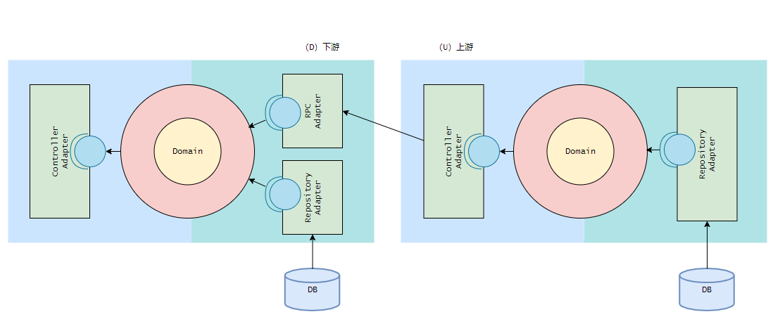 以下是完全基于防腐层设计的服务间通讯。上游系统通过开放公共主机的方式提供服务(主动适配器),下游通过被动适配器来隔离上游系统的服务。