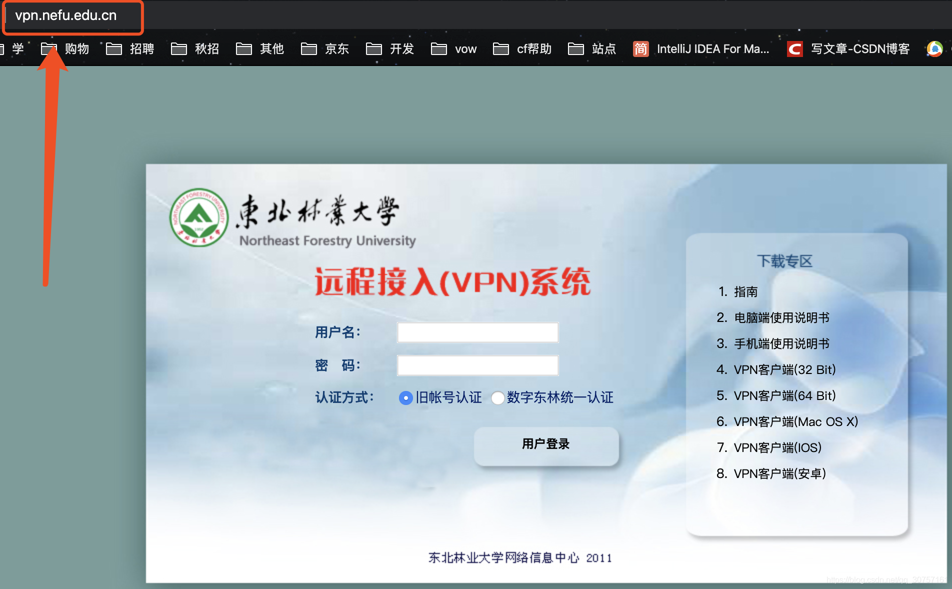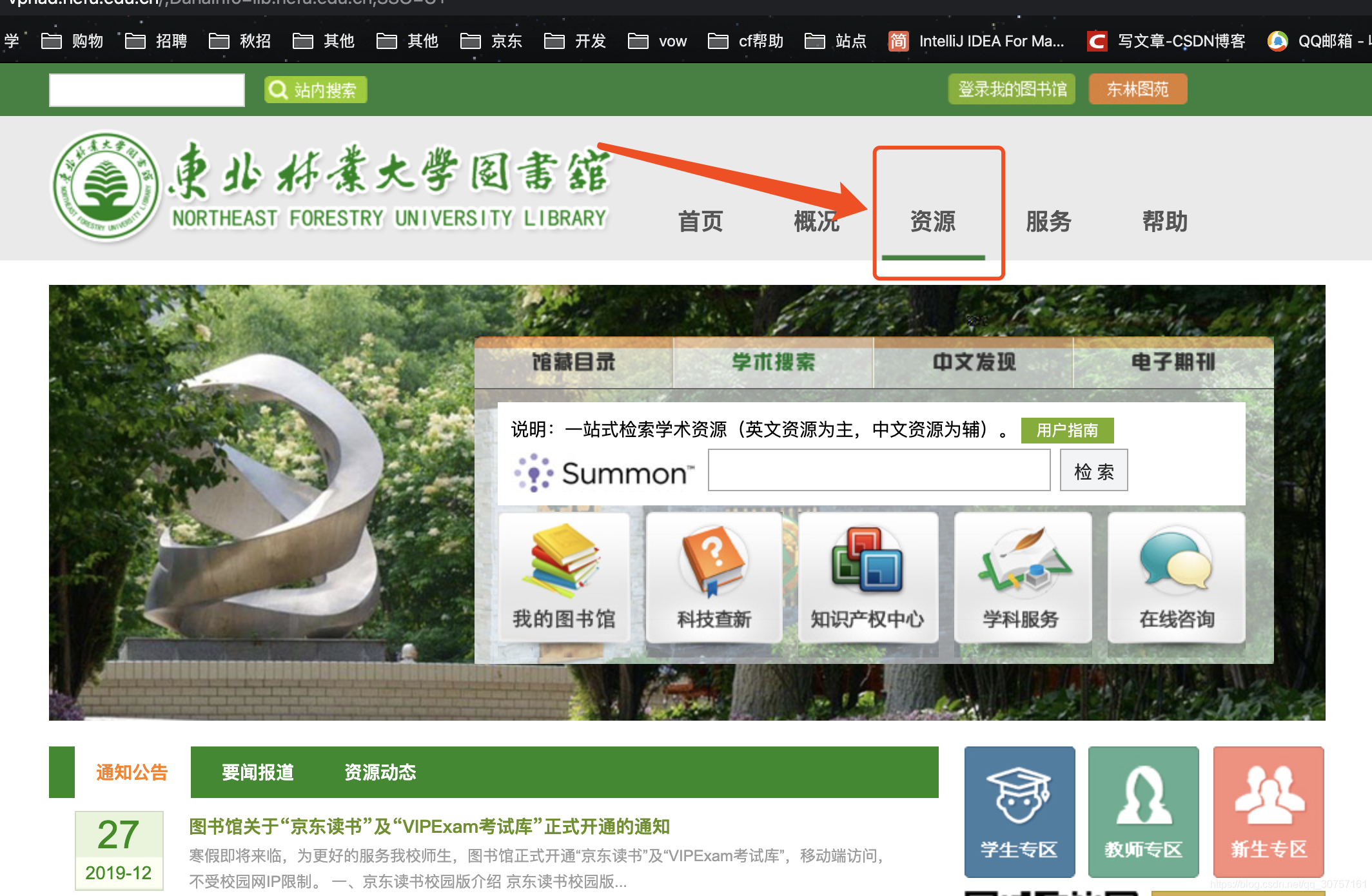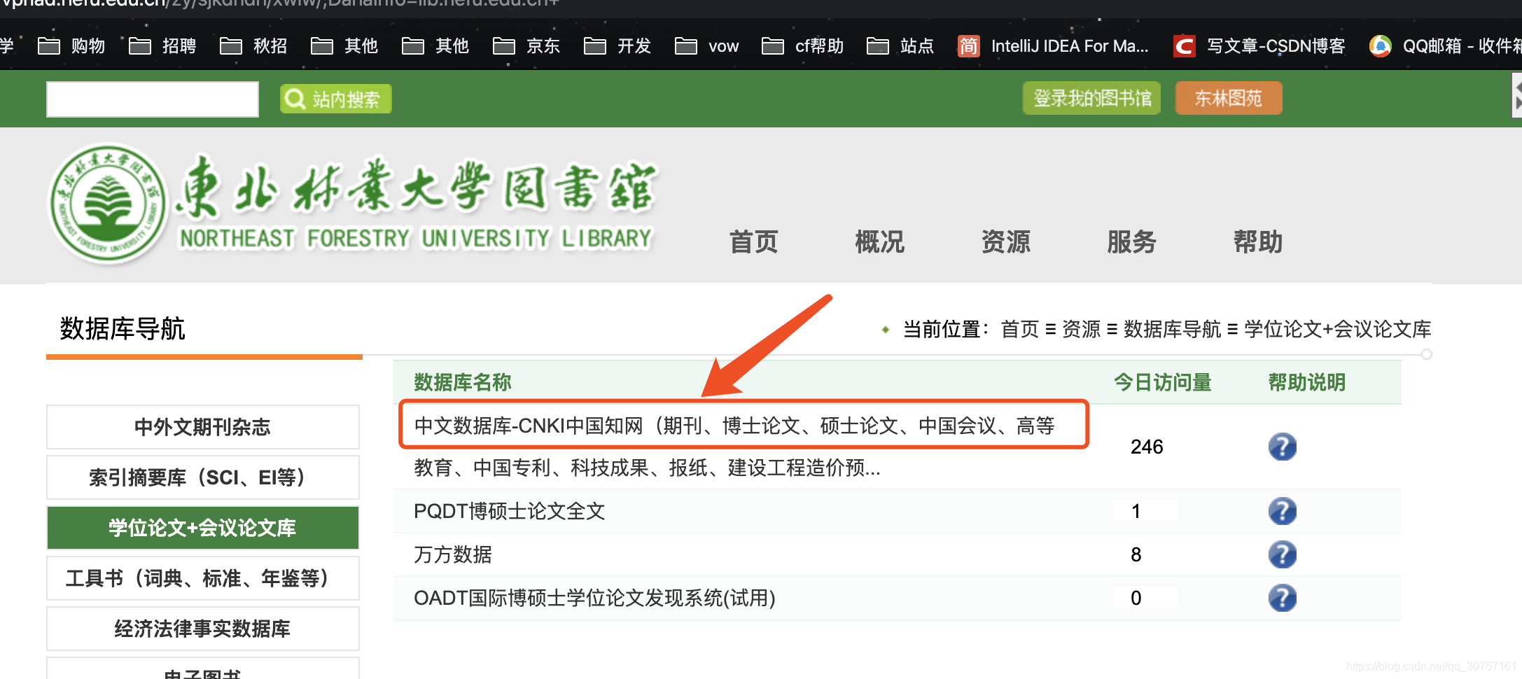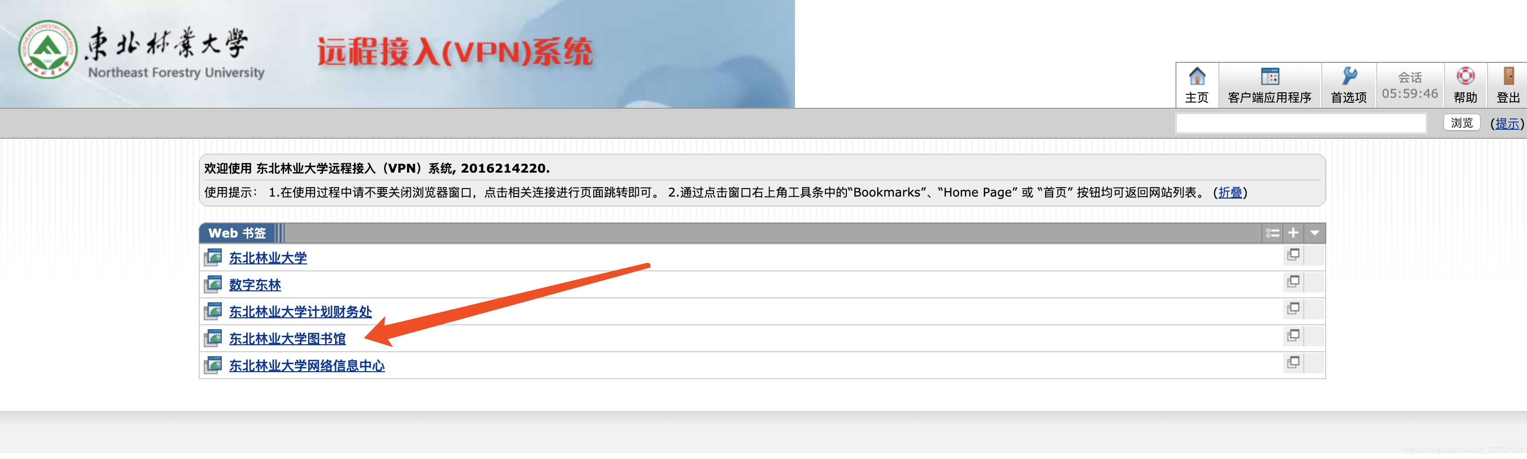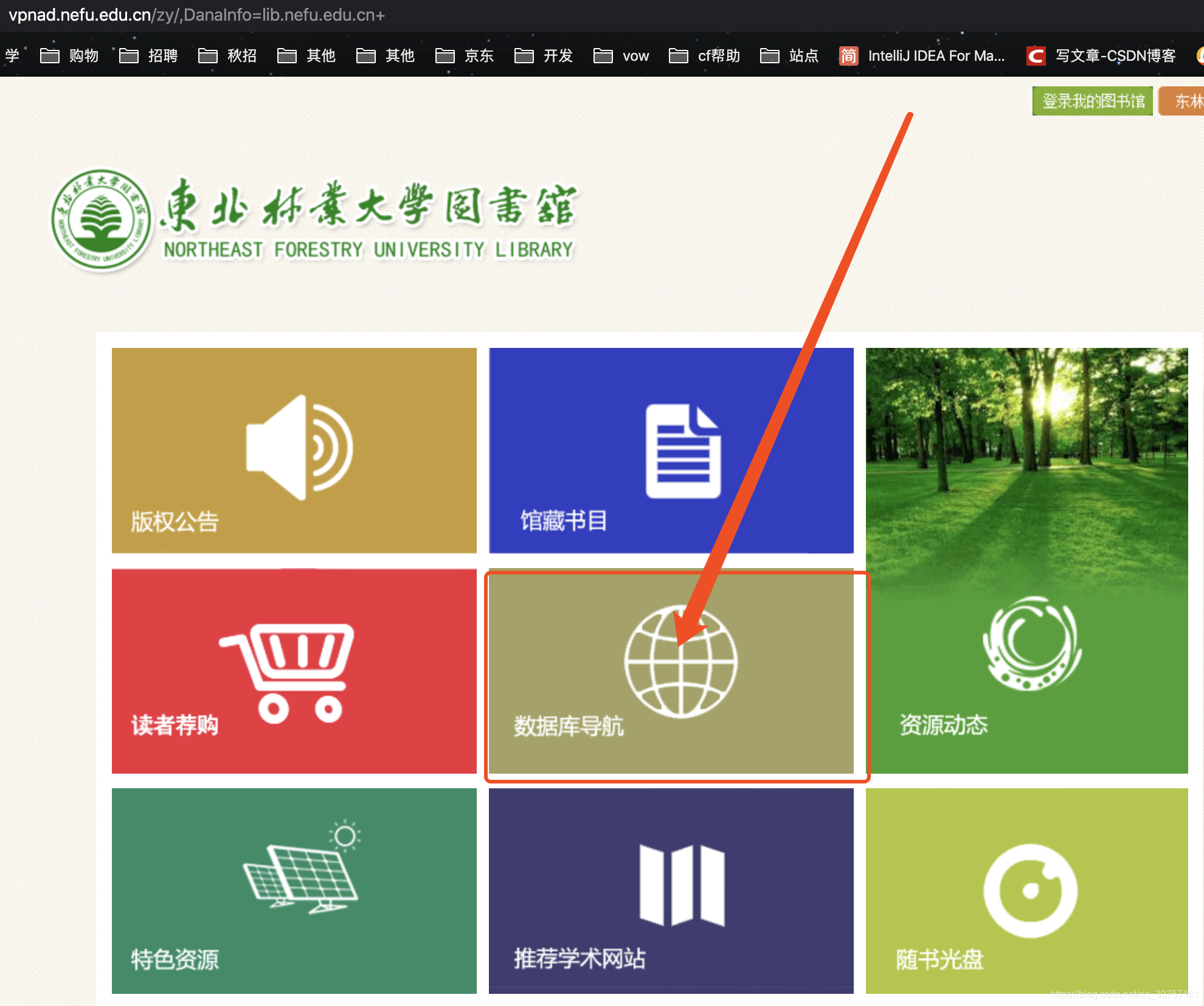 小插曲:此方法纯属自己无意发现,因为自己公司的v**域名是v**.jd.com。便联想到学校应该也有此网站。于是乎尝试了一下自己猜测的域名,果不其然,后来发现了”东北林业大学图书馆“的传送门,便想起了之前选修《信息资源检索与利用》课程,老师讲过可以从这里到知网等数据库网站去,于是乎就点点点,果然发现了,可以解决校外(非校园网)下载知网资料的难题。