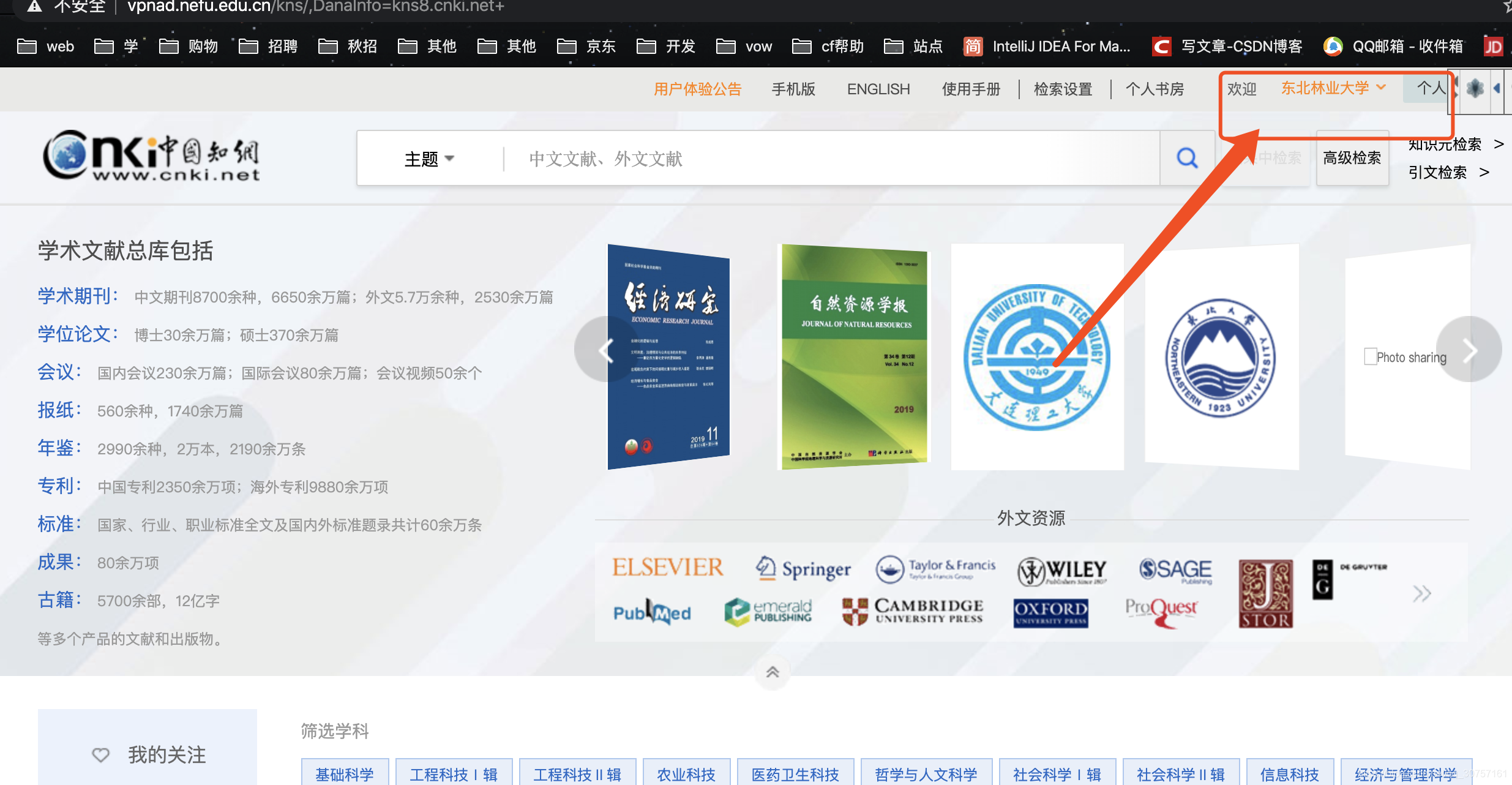 新版知网:可以看到登录账号即为”东北林业大学“账号,即可免费下载海量资料,就可以在家里。远程完成我们的毕业论文了。