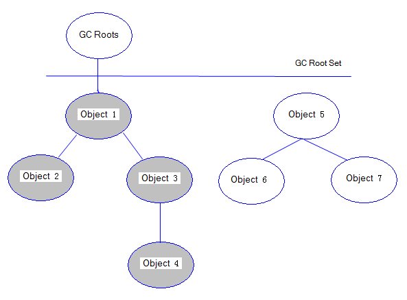 通过下图来清晰的感受gc root与对象展示的联系。所示灰色区域对象是存活的,Object5/6/7均是可回收的对象