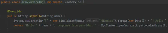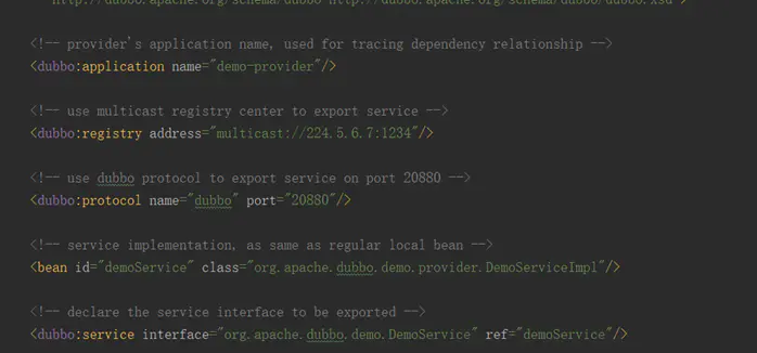服务接口实现类就是我们真正Provider要执行的逻辑,可能有人会问,为什么我们要写一个接口类?不写可不可以?这是一个好问题。如果单纯的看Provider确实没有写这么一个接口的必要,但是对于Consumer来讲意义就大不相同了。RPC(Remote Procedure Cal)远程过程调用的目的就是要即便Consumer和Provider不是运行在同一台机子上,但是对于Consumer来讲就是像调用本地方法一样去调用Provider,所以Consumer至少得有Provider的接口,这样Comsumer才能知道Provider有哪些方法,至于具体怎么怎么做后面会解释,请稍安勿躁。接着,解释一下配置文件的含义
