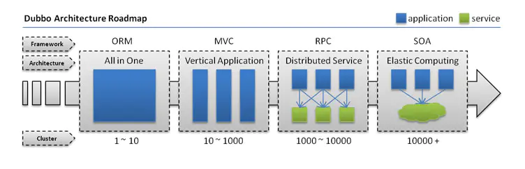 孟子云:“颂其诗,读其书,不知其人可乎,是以论其世也。”讲的使我们要透彻的理解一篇文章,就必须要知道作者的生平际遇。互联网架构亦是如此,经历了单一应用架构、垂直应用架构、分布式服务架构和流动计算架构。服务的粒度越来越细化(比如以前一个网站后端只需要一个tomcat运行一个Servlet程序,现在前端一个请求过来,后端会有很多个tomcat容器分别运行着不同的Servlet,他们之间相互调用,最后再由第一个Servlet返回给前端),服务治理的问题就越发的明显,所以优秀的架构师们就在思考可不可以有这么一个优秀的架构替我们解决服务之间的调用问题?当然了,如果能高可用就更好了。如果有负载均衡就最好不过了。因此,我们的Dubbo框架就呱呱坠地了。