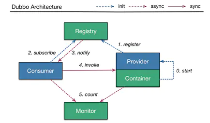 Dubbo大体的流程是这样的:先用容器Container(当下以Docker为代表的应用级虚拟化技术,为了容易理解可以粗糙的以为一个虚拟机)启动我们的服务Provider。然后将其IP(192.169.0.1)注册到注册中心Registry去(通常我们会采用ZooKeeper这样的分布式应用服务协调程序)。接着我的服务调用方Comsumer就会去注册中心去订阅Subscribe相关服务。注册中心会异步的方式将你消费者需要的服务的地址列表推送Notify给你。消费者就会将整个地址列表缓存在本地,当业务需求到来时,就会使用地址列表里的地址去请求相关的服务程序。至于Monitor顾名思义就是监视器的含义,消费者和提供者会定时将服务的调用次数和被调用的次数发送给监视器。