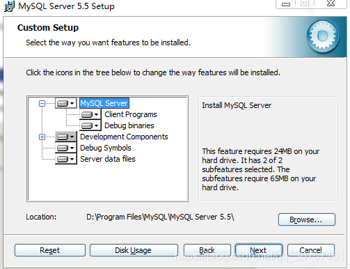 2、然后进入的是类型选择界面,这里有3个类型:Typical(典型)、Complete(完全)、Custom(自定义)。这里建议 选择“自定义”(Custom)安装,这样可以自定义选择MySQL的安装目录,然后点“Next”下一步,出现自定义安装界面,为了数据安全起见,不建议将MySQL安装系统盘C目录。
