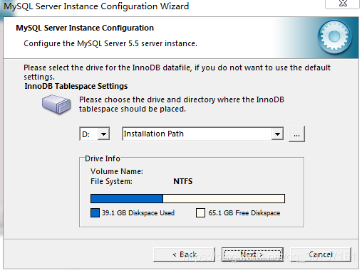 9、这里是配置MySQL的 InnoDB表空间,有些用户可能想要将InnoDB表空间文件放到不同的位置,而不放到MySQL服务器数据目录。如果你的系统有较大的空间或较高性能的储存设备(例如RAID储存系统),则最好将表空间文件单独放到一个位置。要想更改InnoDB表空间文件的默认位置,从驱动器下拉列表选择一个新的驱动器,并从路径下拉列表选择新的路径。要想创建路径,点击 ...按钮。如果你要更改已有服务器的配置,更改路径前你必须点击Modify按钮。此时启动服务器之前,你必须将已有表空间文件移到新位置。本人选择的默认配置。