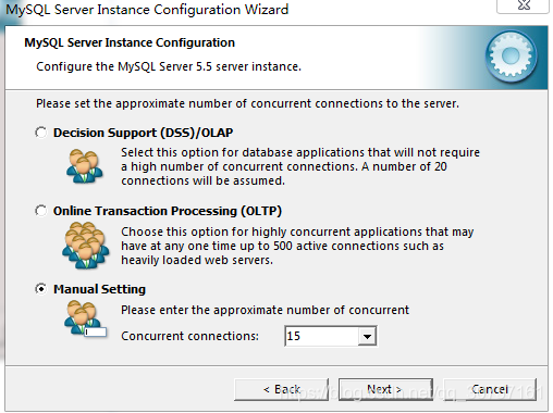 Online Transaction Processing(联机事务处理)(OLTP):如果你的服务器需要大量的并行连接则选择该选项。最大连接数设置为500。