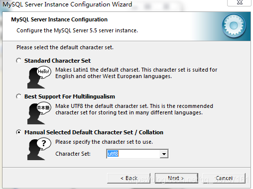 Manual Selected Default Character Set/Collation(人工选择的默认字符集/校对规则):如果想要手动选择服务器的默认字符集,请选择该项。从下拉列表中选择期望的字符集。