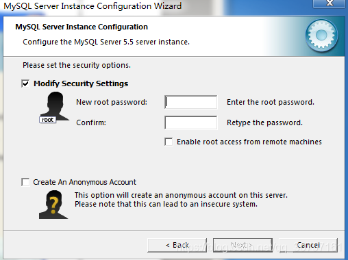 14、这里是配置MySQL的安全选项,强烈建议为你的MySQL服务器设置一个root密码,默认情况MySQL Configuration Wizard(配置向导)要求你设置一个root密码。如果你不想设置root密码,不选中Modify Security Settings(修改安全设定值)选项旁边的选择框。要想设置root密码,在New root password(输入新密码)和Confirm(确认)两个框内输入期望的密码。如果重新配置已有的服务器,你还需要Current root password(当前root密码)框内输入已有的root密码。要想防止通过网络以root登录,选中Root may only connect from localhost(只允许从本机登陆连接root)选项旁边的框。这样可以提高root账户的安全。要想创建一个匿名用户账户,选中Create An Anonymous Account(创建匿名账户)选项旁边的框。创建匿名账户会降低服务器的安全,并造成登录和许可困难。因此不建议。
