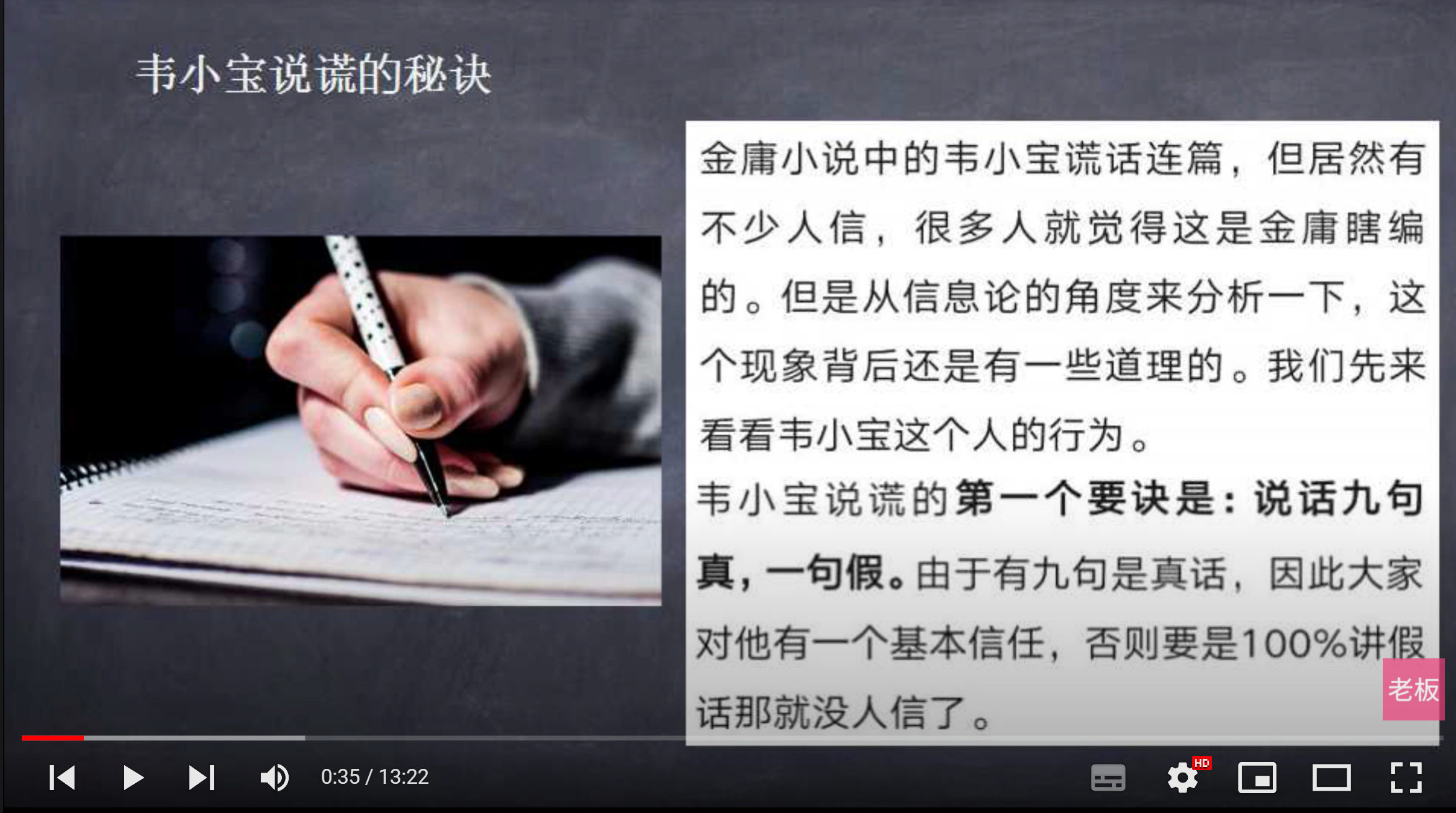 课后感悟01: 韦小宝满口谎言,因为灵活运用了信息论的信息加密,9真1假可以让别人对自己产生部分信任,因为有基础的信任,所以才有欺骗的可能性,生活里对于陌生人大可不必保持太高的警惕心,反而是所谓的朋友,满口的仁义道德,满心的坦诚以待,但是这种假朋友的背叛更让人难过伤心,所以生活里辨别真假朋友,如果是假朋友,不要有太深入的交际;有些人招蜂引蝶,有些人恶臭难闻;也不必花费太多的心思去维护太多的真朋友,朋友在真心知己之交;对于有相互利益诉求的人自然是越多越好,利益下的人际就不能要求对方不可以背叛,对方基于自己好处,自己也要给予对方好处和利益;不然一次交易往往没有太大意义;对于异性而言,还有另外一种互换,就是性,这也是男女之间最原始的诉求,因此男女的信息加密就会有别于同性之间,因此男女之间有没纯洁的革命友谊之本身就是需要怀疑的;