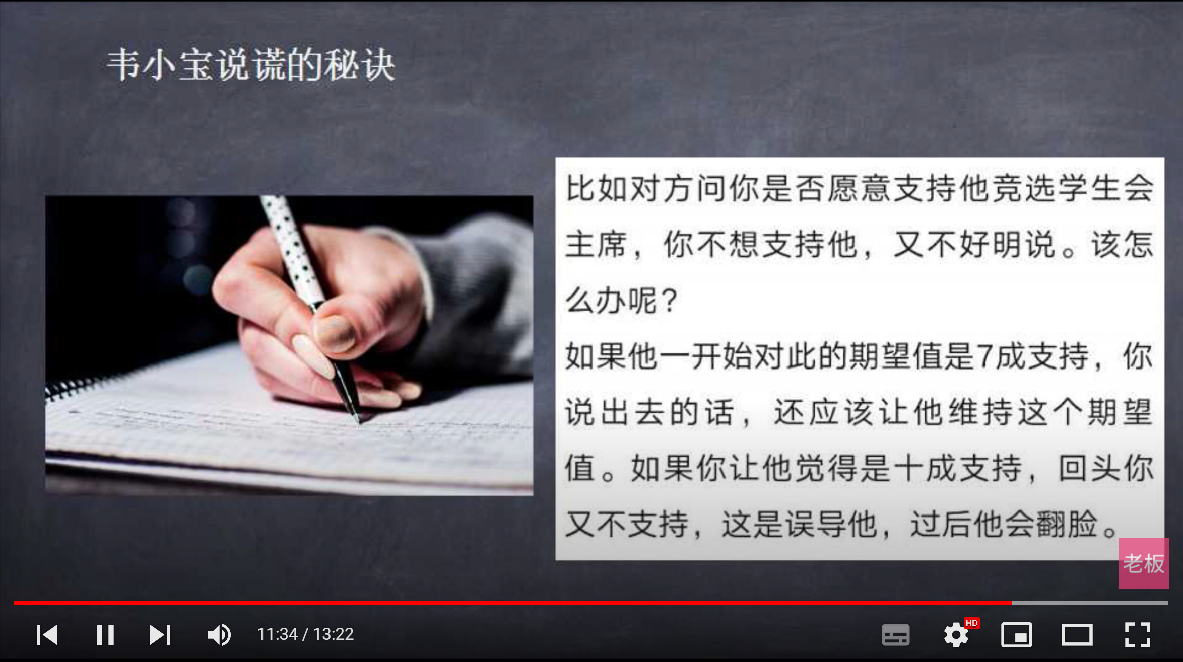 课后感悟02:对于这个复杂的社会,你不能总是说真话,但是可以选择不说,但也不是学习韦小宝一样说谎话获得最大利益,对于大多数男性来说,只不过是羡慕韦小宝有7位人妻而已,韦小宝之所以敢于并且说谎话并且不用承担后果,是因为背后有人,中国所有经典名著只用读懂一个道理就行了,那就是“我背后有人”,那你就是最纯粹的中国人了;韦小宝可以骗所有人,但是很少骗到皇上,是因为皇帝人中龙凤,天资聪颖,大可不必如此解读,其他人因为韦小宝背后的皇帝,所以只要不危及性命,被骗也就被骗了;因为韦小宝背后的帝王势力,所以才会顺风顺水,和氪金玩家没得玩的,现在大多数富二代还是比较有教养的,反而是自以为猖狂的那些跳梁小丑,社会对他们的评价基本就是傻逼;越是有钱和势力的便越是隐藏的越好,反而是小利益的既得者无法无天;如果韦小宝背后没有康熙这位韦爵爷早就归西了,现实生活里,韦小宝这种人不可交,绿人者,人恒绿之;欺人者,人恒弃之;我们可以利用信息加密保护自己的隐私和生活,但是绝不可以用来行欺诈之事,不然路会越走越窄;