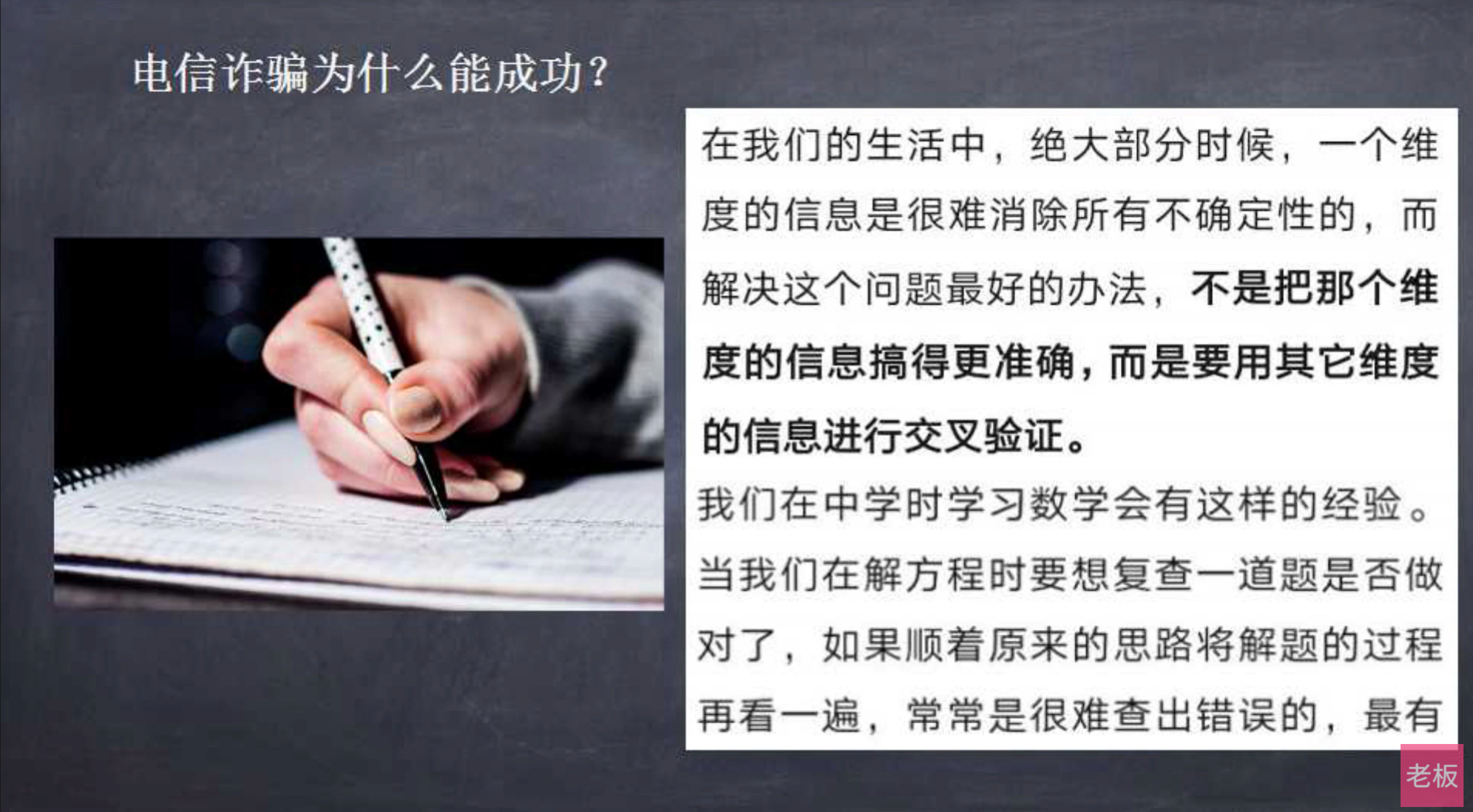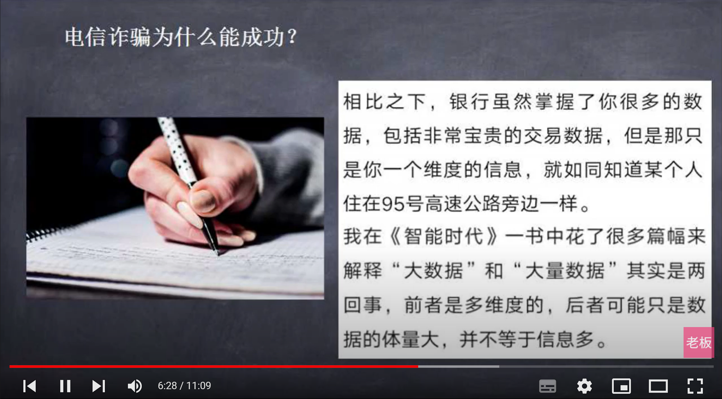 课后感悟:我们处于大数据时代,但是也需要明白,大数据不是单纯的知道大数据量,大数据是对同一事物的多维度信息集合,但是大数据量只是单纯的体量很大,就好比银行持有全世界的交易信息,和电商平台从多个维度采集到的一个人的信息,即使电商保有的个体的信息只有不到 1M ,银行持有交易的数据几十兆,前者可以成为大数据,后者只能是大数据量的一种表征;电信诈骗之所以可以成功,是因为诈骗分子可以通过基础的个人信息通过交叉验证从而获取其他维度的信息,因此社交平台对于个人的自画像甚至比本人还要了解自己;这个就是和算命如出一辙,算命先生通过交谈或者旁敲侧击从而知道对方的多维度信息,再通过心理学的一些方法从而知道对方所求;因此现代社会有足够的理论可以阐述和解释所谓玄之又玄的东西,我们生活里可以通过信息论的一些方法更好的处理工作里的问题,但是绝不可以有害人之心,或者通过交叉验证欺诈他人,当然了乐意做神棍没人阻拦的,但是既然可以灵活运用这些知识,不如做些对社会和他人有益的事情;