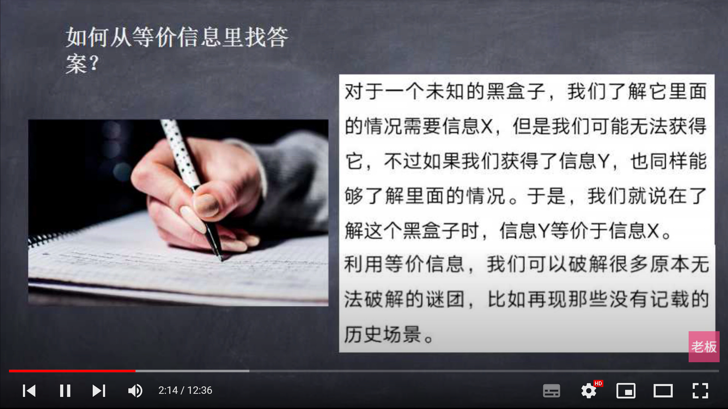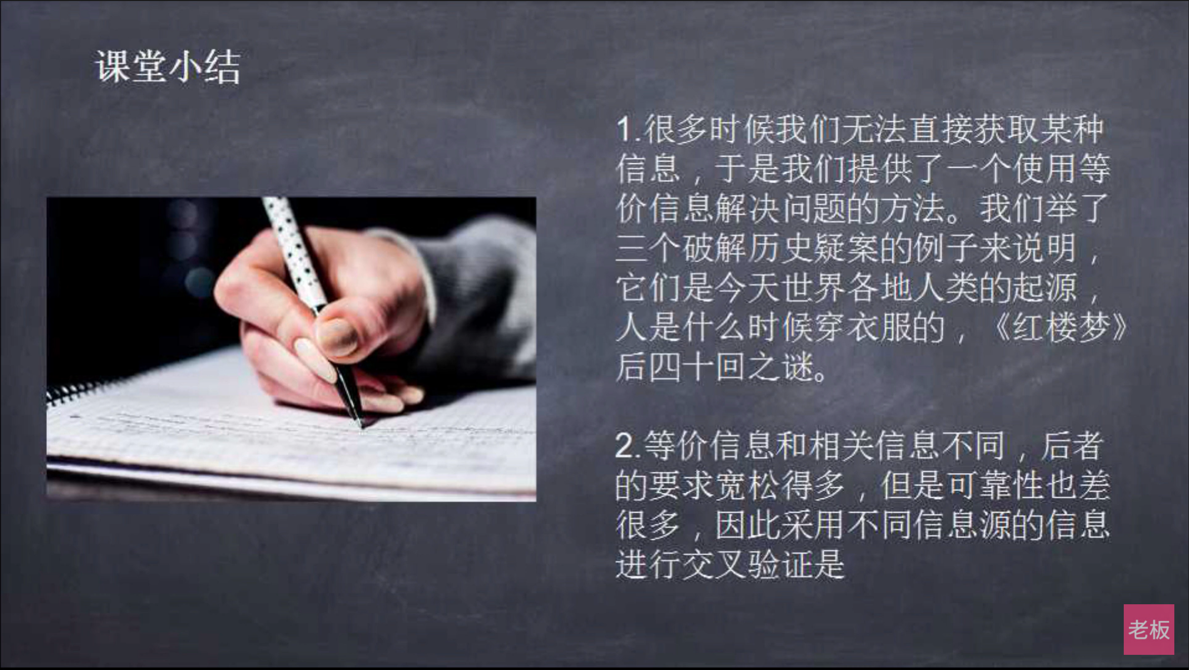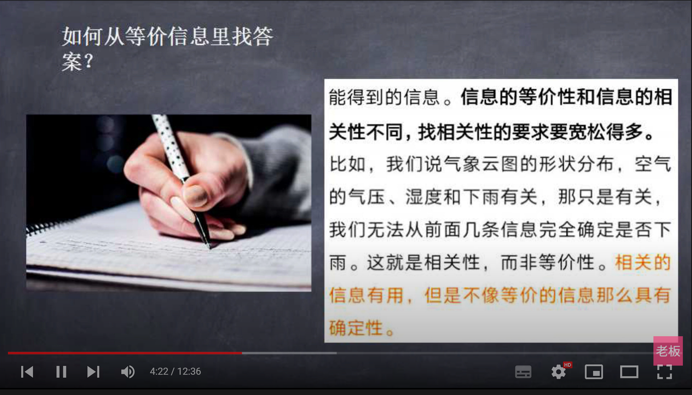 课后感悟:信息等价性,可能是这个世界太复杂了,人类上万年的时间都没有弄明白这个宇宙的起源,上千年的时间都在盲目的宗教崇拜,即使目前科技发达,人类对这个自然的解读也是局限于现有的认知体系里面,正是因为世界没有那么容易认知,所以先贤们才会通过等价信息侧面的印证所谓的真理;无论是伽利略的比萨斜塔实验或是冥王星是否是行星的推测,人类无法直观的观测和验证真理,只能借助等价信息进行推测,这就好比大学时讲过的数字逻辑一般,因为。。。所以。。。如此这般;当然等价信息不是相关信息,等价信息可以相互推导彼此,相关信息只是一种附加属性,就像秦始皇是一个伟大的人,如何伟大,比如统一中国,就是一种相关的举例说明,当然等价信息不只是应用科技领域,历史,政治,地理等等学科都可以进行运用,哪怕是金融领域,因为无法直白得到想要的信息,所以可以通过旁敲侧击进行等价印证,这就类似密码学,我言语天气有风,实则暗示股价波动;对聪明人可以暗送秋波,但是对于蠢笨之人,必须要噤声少言;