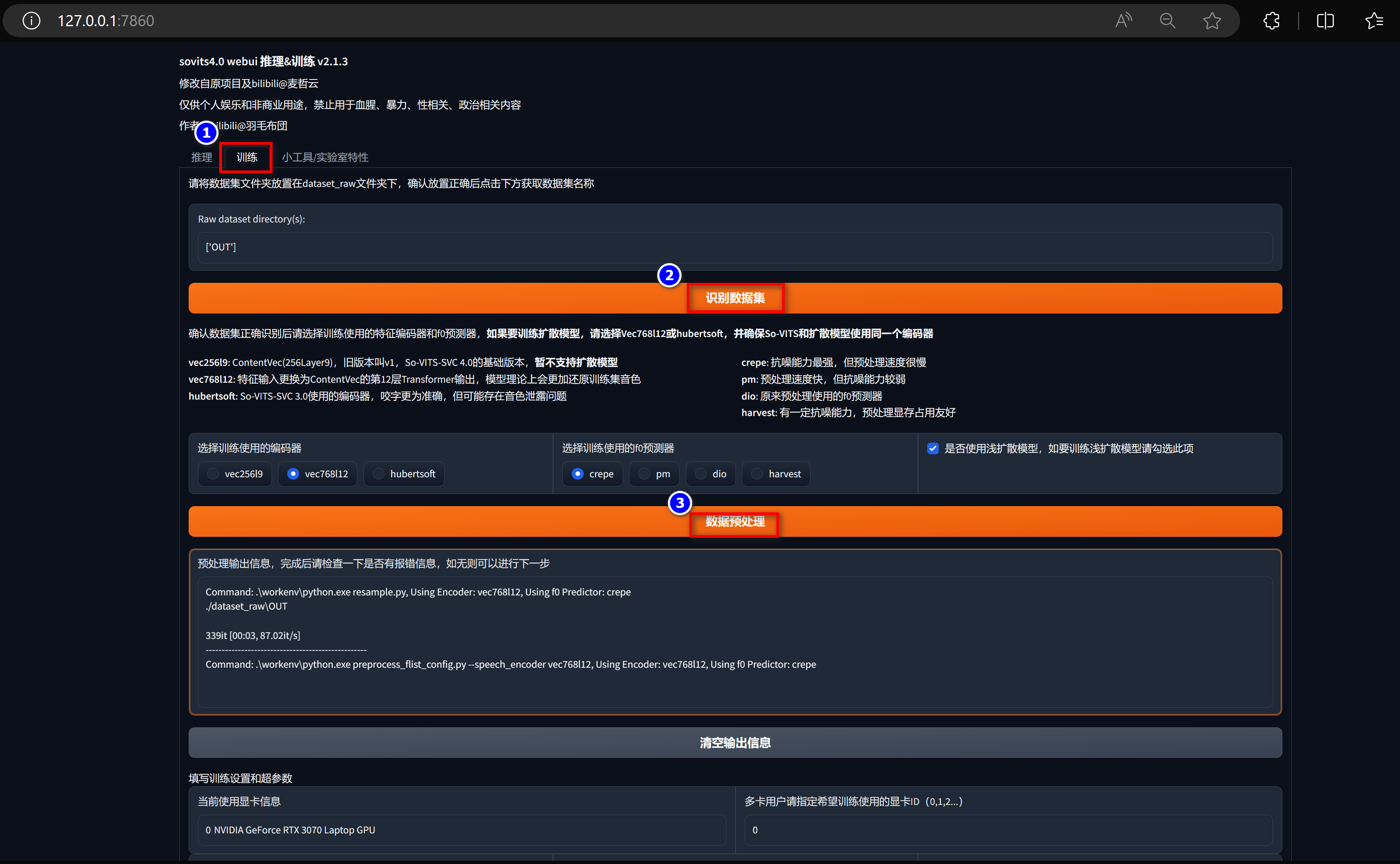 说明: 数据预处理的话,需要小心爆显存的问题,可以通过预测器的切换进行数据预处理,这个一般的配置也是 8G 显存起步才可以,否则的话,数据预处理就无法通过的;