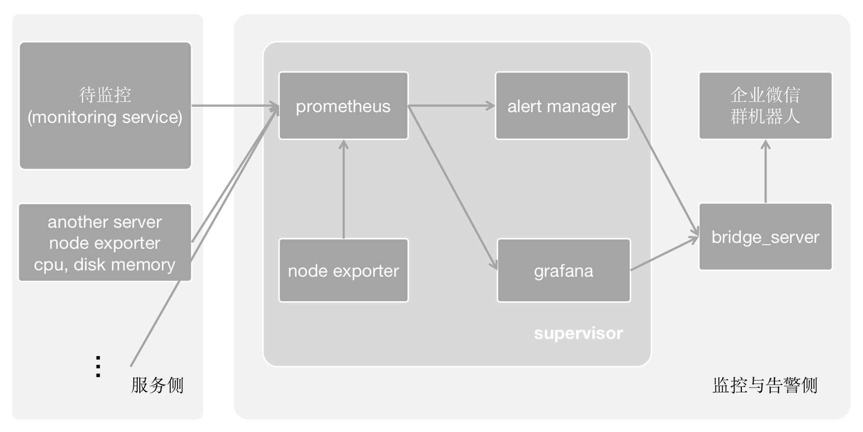 Supervisor是一套通用的进程管理工具,能将一个普通的命令行进程变为后台daemon,并监控进程状态,异常退出时能自动重启。这里用来管理监控所需要的几大组件,保证监控系统持续良好运行。Prometheus是开源监控报警系统, 其基本原理是通过HTTP协议周期性抓取被监控组件的状态,任意组件只要提供对应的HTTP接口就可以接入监控。Alertmanager是一个独立的告警模块,接收Prometheus等客户端发来的警报,之后通过分组、删除重复等处理,并将它们通过路由发送给正确的接收器;告警方式可以按照不同的规则发送给不同的模块负责人。node_exporter用来监控服务器CPU、内存、磁盘、I/O等信息。