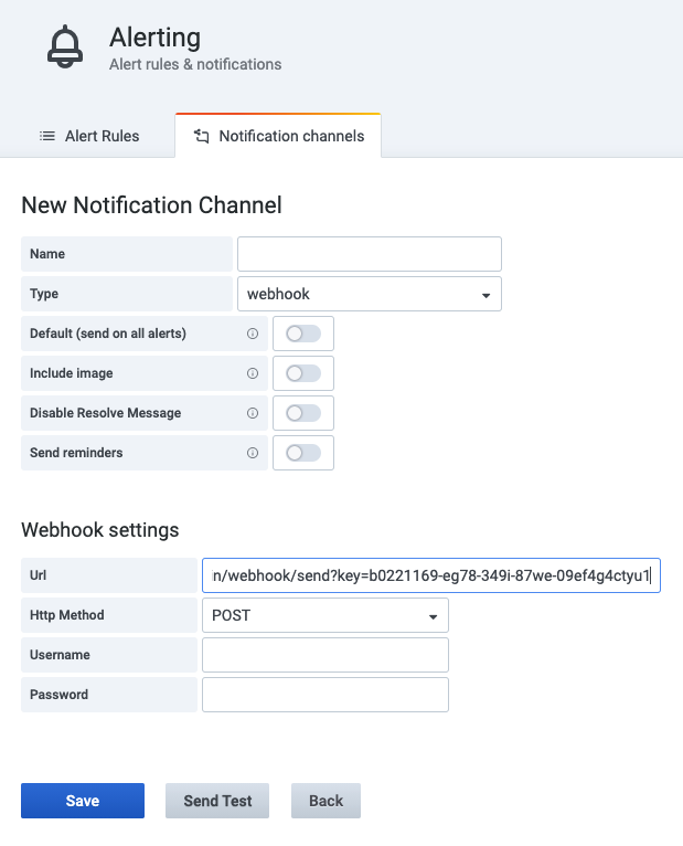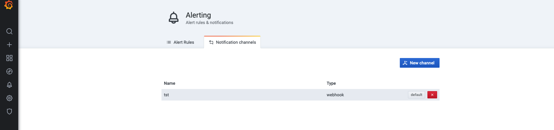 上图上面的Alert按钮可以为此统计数据设置告警,不过在这里设置告警之前需要先在Alerting页中添加告警通道: