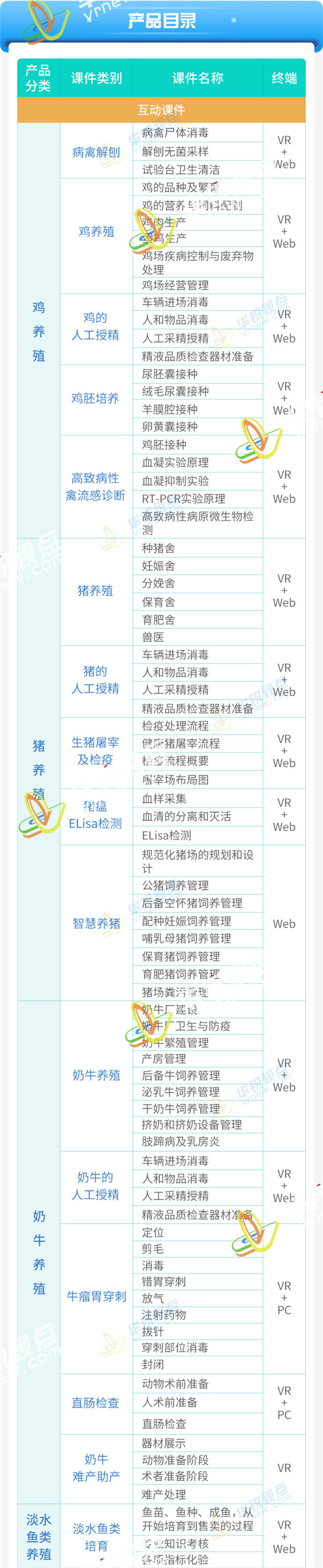 成立15年之久,华锐视点在畜牧养殖领域合作了六家知名高校,覆盖动物生产、医疗、养殖等常见实训教学内容,通过强交互、高逼真的兽医解剖模拟仿真vr虚拟实验系统,极大提高了学员动手实操技能和熟练度,创新产业人才培养新模式。