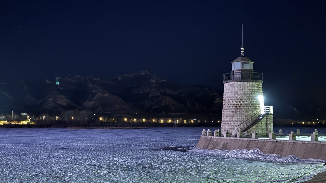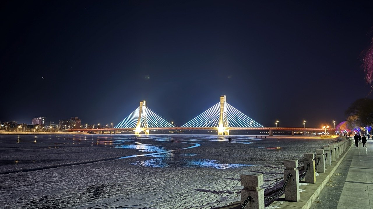 看着两座大桥和河边的灯光,还有点夜之城的感觉了。