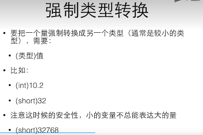 强制类型转换(大的值转换为小的值,比如(int)10.2,double类型将会被强制转换成int)
