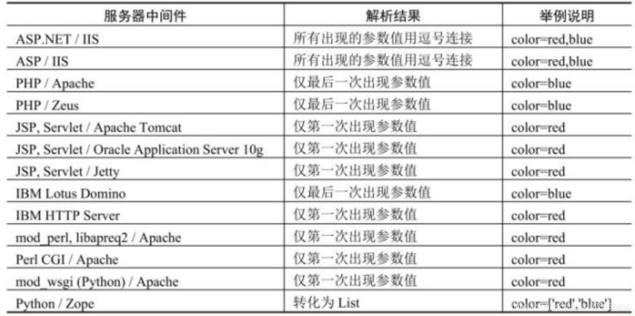 HTTP参数污染是指当同一个参数出现多次,不同的中间件会解析为不同的结果。具体如下图所示:(以参数color=red&color=blue为例)。