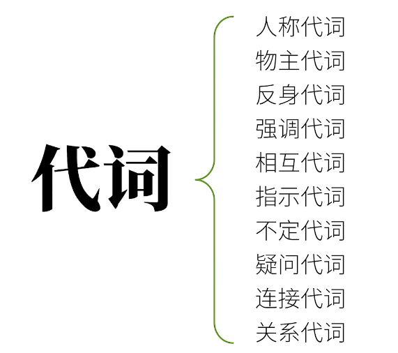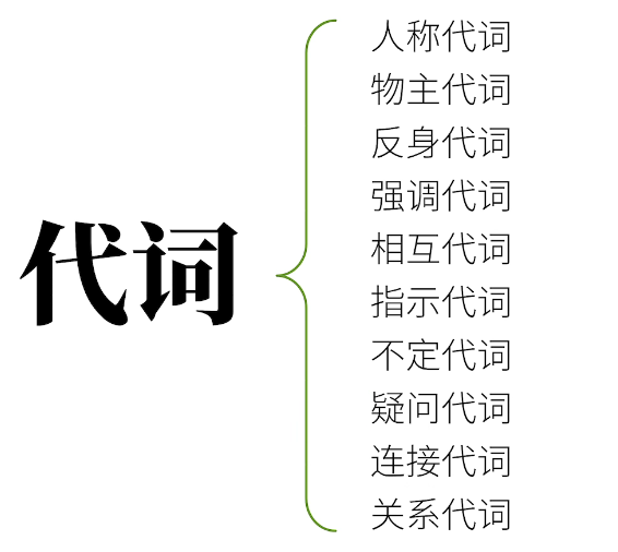 代词也是英语语法的难点之一,主要是因为它的种类繁多,包括人称代词、物主代词、反身代词、强调代词、相互代词、指示代词、不定代词、疑问代词、连接代词、关系代词。