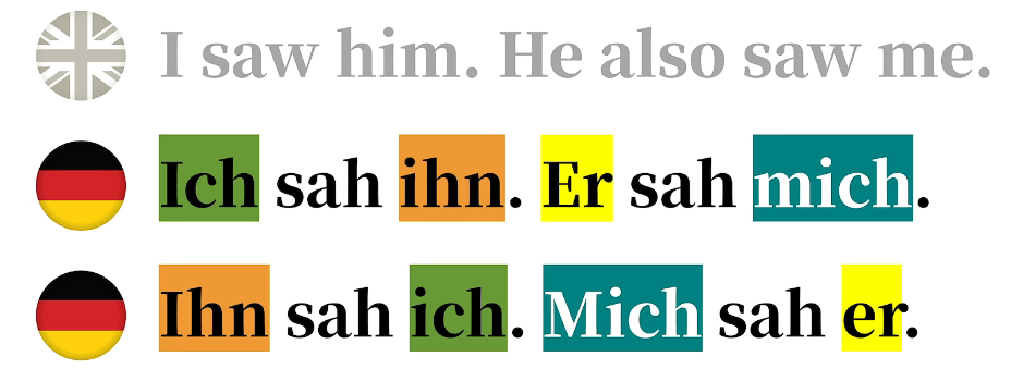 注意到第二句的语序了吗?简单互换人称代词的位置,但语义不变。就是因为格的帮助。当然正常情况下德国人不这么说。