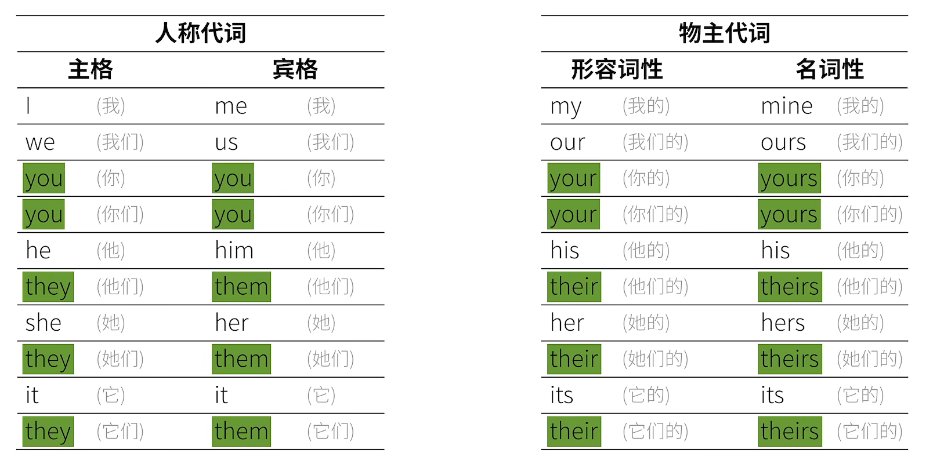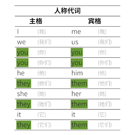 你应该注意到了, you 和 it 既可以做主格,又可以做宾格。从好的方面考虑,这样你可以少记几个代词,但是从坏的方面说,同样的拼写可以做不同格,往往会让人搞混淆。