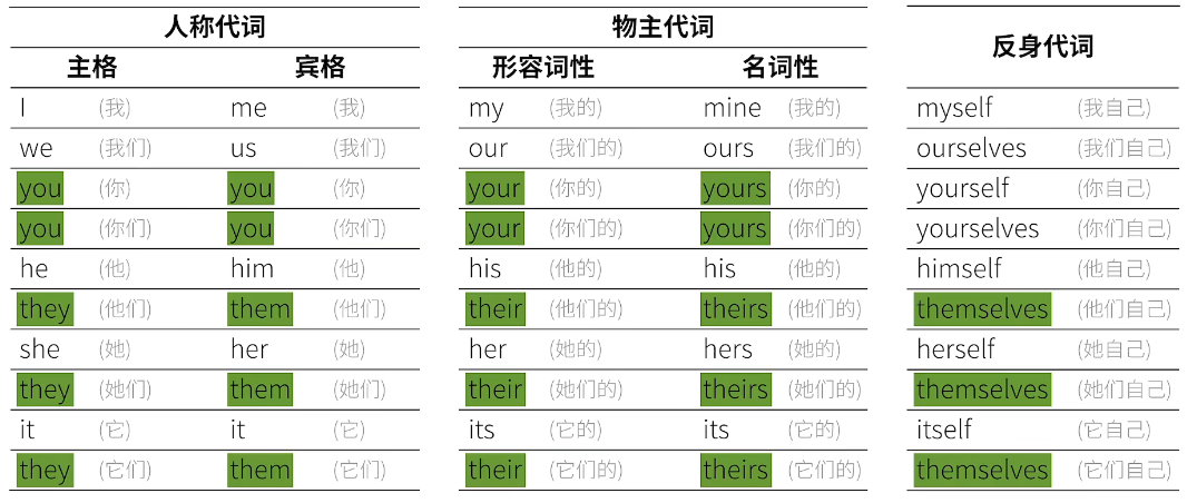 请特别注意,反身代词中有几个是宾格人称代词加上 self 或 selves(自身),不是物主代词加 self 或 selves: