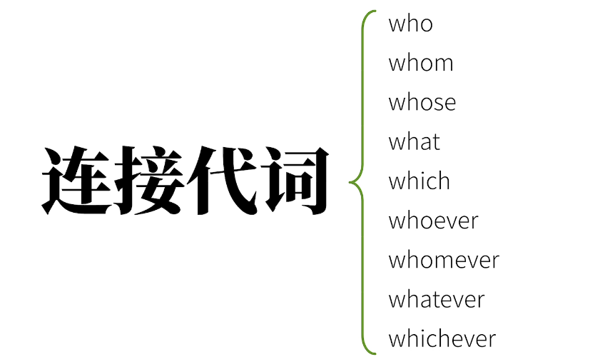连接代词有:Who、 Whom、 Whose、 what、Which、Whoever、whomever、Whatever、 whichever。