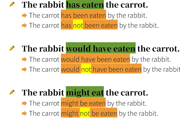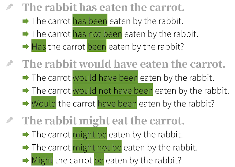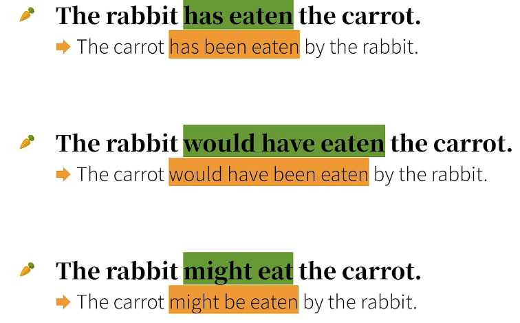 the rabbit 是动作 ate(原形 eat)的执行者, the carrot 是动作 ate 的承受者。如果变成被动语态,就是强调动作的承受者。让 the carrot 称为主语,咱们就首先要调换主语和宾语的位置。即: