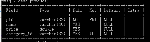 create table product(pid varchar(32) PRIMARY KEY,name varchar(40), price double);
