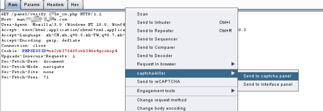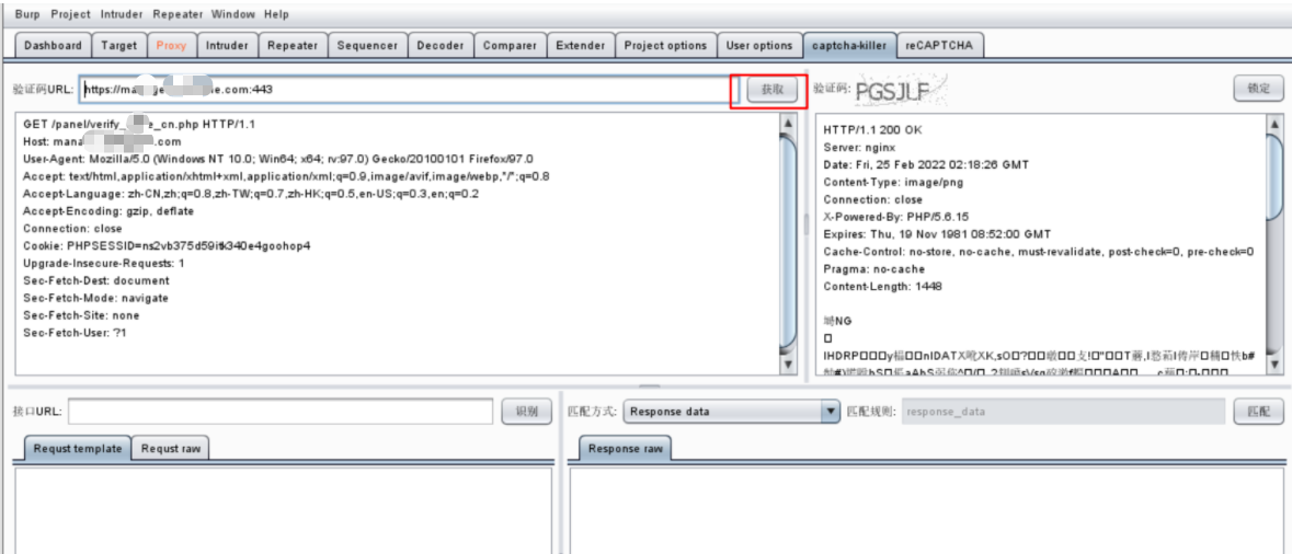 (2)打开验证码生成链接,并进行抓包,然后把包发送到插件