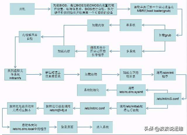 先通过一张图来简单了解下整个系统启动的流程,整个过程基本可以分为POST-->BIOS-->MBR(GRUB)-->Kernel-->Init-->Runlevel。下面会详细说明每个过程的作用。