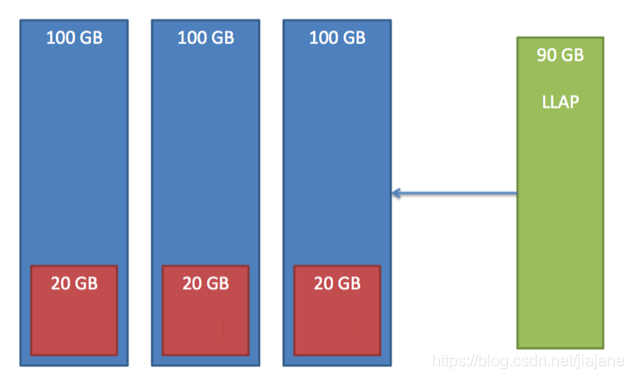 例如,下图显示了一个具有3个节点的群集,该群集具有长期运行的20 GB容器。LLAP守护程序需要90 GB的群集资源,但不会发生抢占,因为可用队列的容量不足,相对资源使用率较低。在任何节点上只有80 GB可用空间时,LLAP必须等待长时间运行的应用程序完成才能访问群集资源。