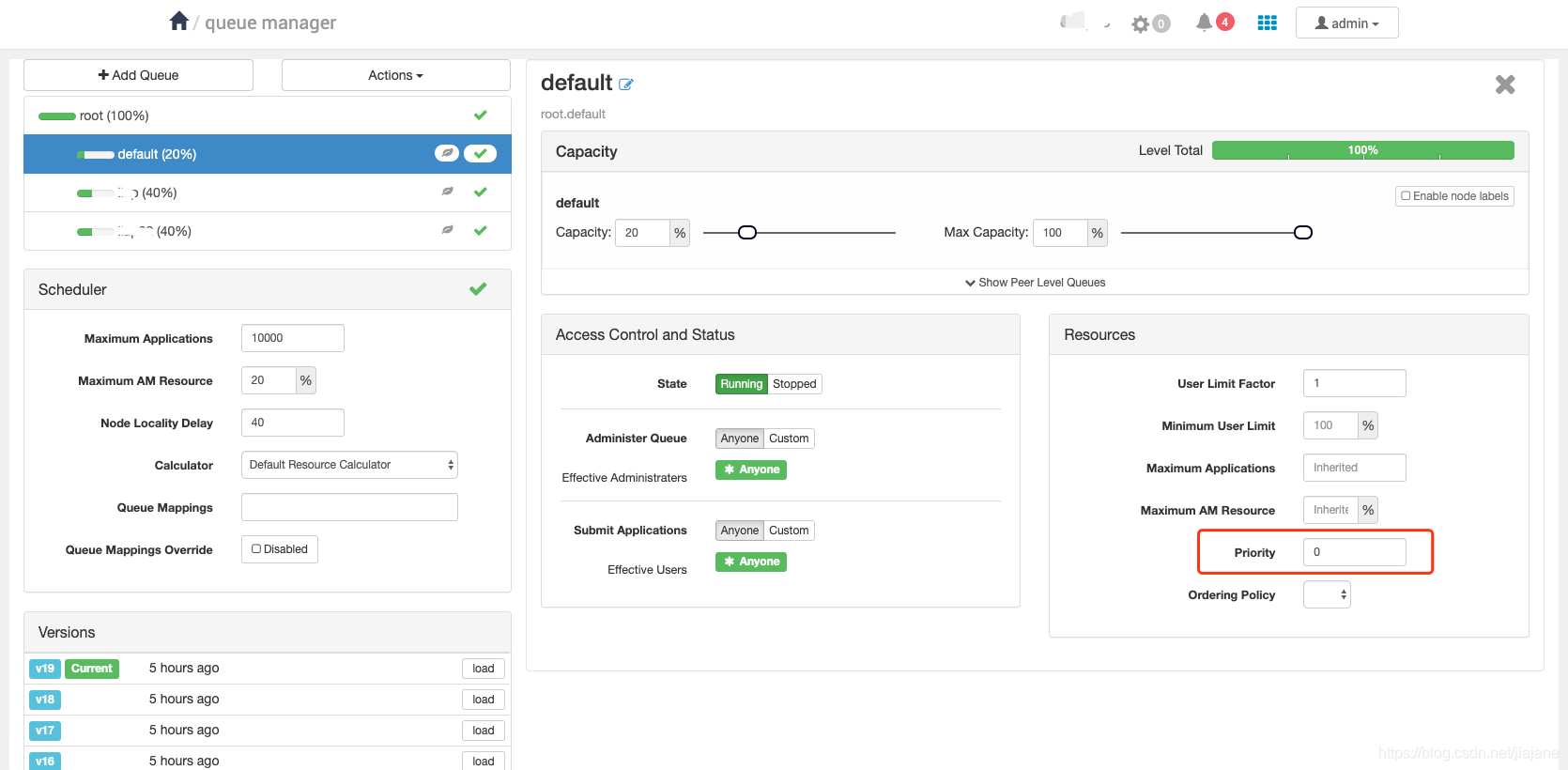 1 <property> 2 <name>yarn.scheduler.capacity.root.acl_administer_queue</name> 3 <value> </value> 4 </property> 5 6 <property> 7 <name>yarn.scheduler.capacity.root.support.acl_administer_queue</name> 8 <value>sherlock,pacioli cfo-group</value> 9 </property>