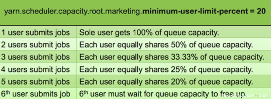 考虑一个root.qA.capacity配置为100%和 minimum-user-limit-percent配置为33%的队列qA 。这意味着向队列提交应用程序的前三个用户每个都可以使用至少33%的队列资源。如果这三个用户已经按照指定使用了队列的资源,则任何其他用户都必须等待资源分配后再提交应用程序。