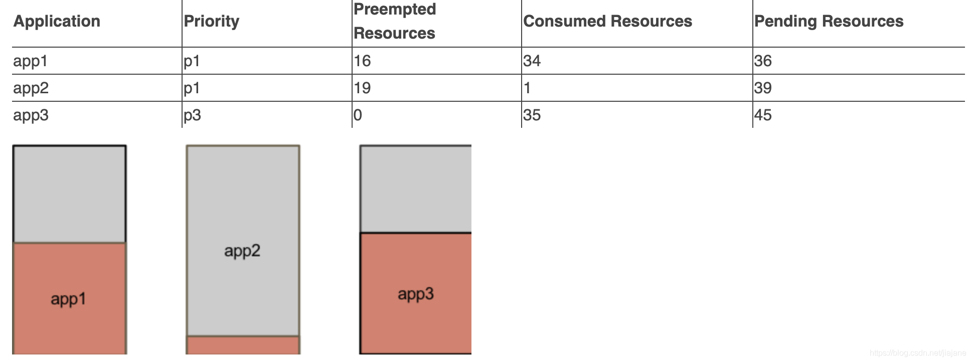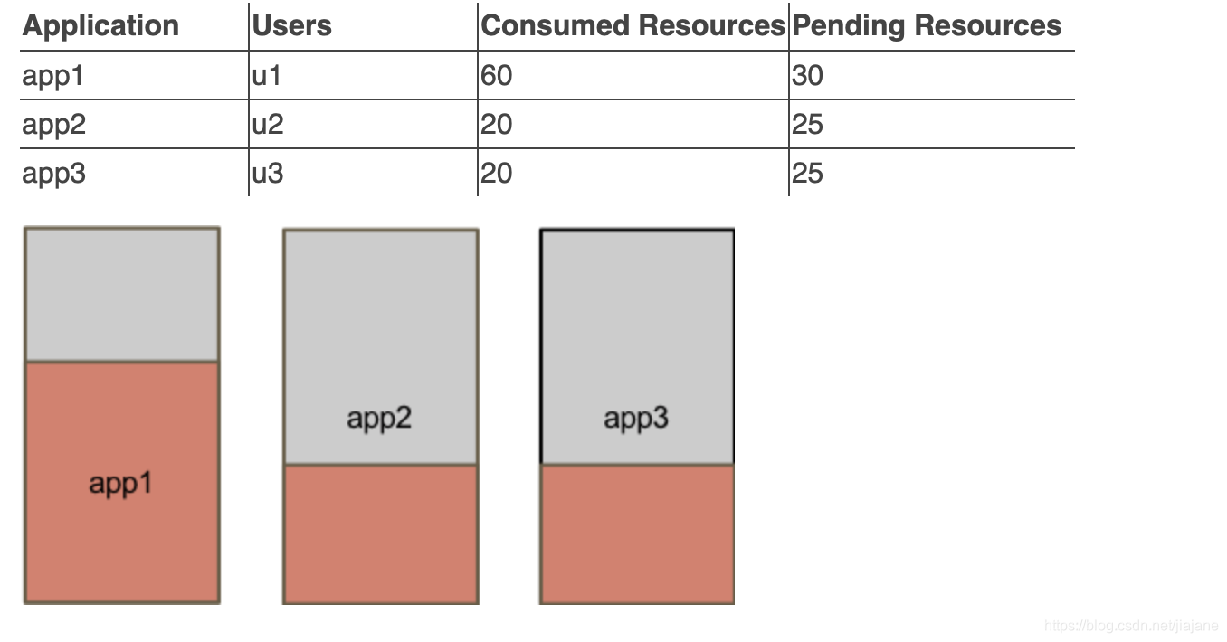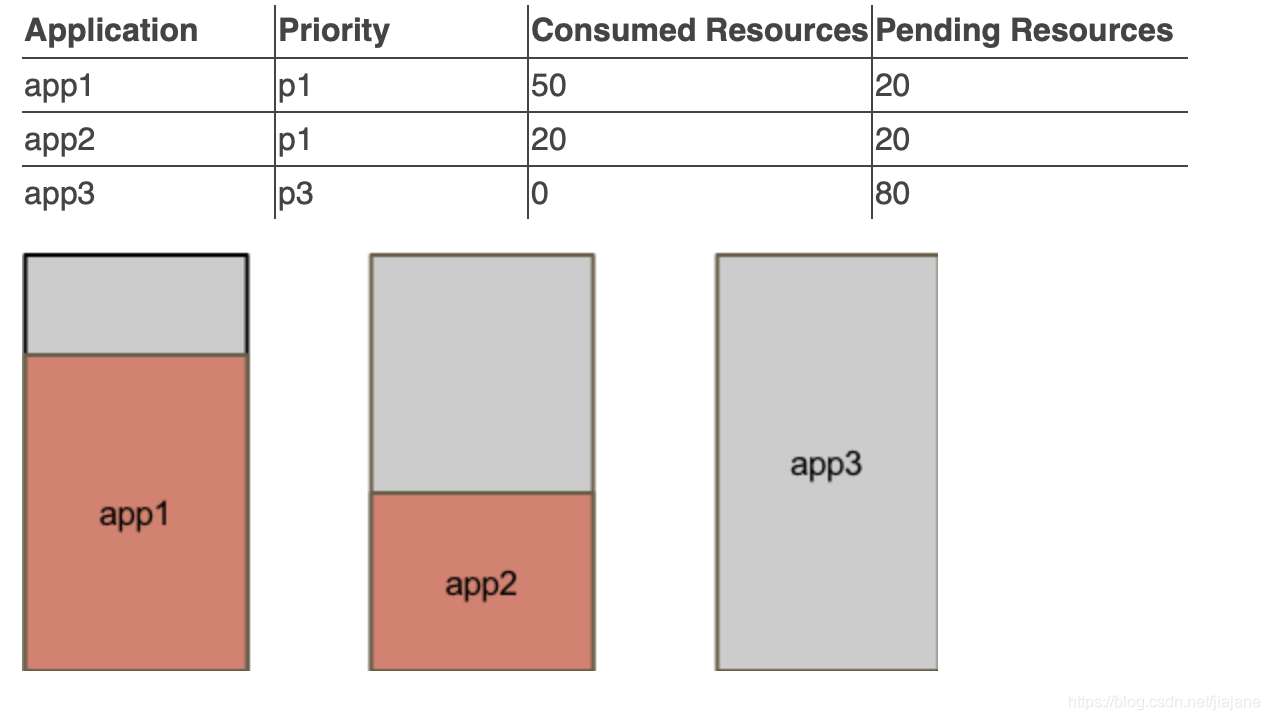 如果在队列上启用了基于应用程序优先级的抢占,则会从app1和app2中抢占资源,以便运行更高优先级的app3。