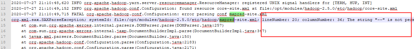 这是啥子,说mapred-site.xml文件 20行有个 “--” 符号,上图: